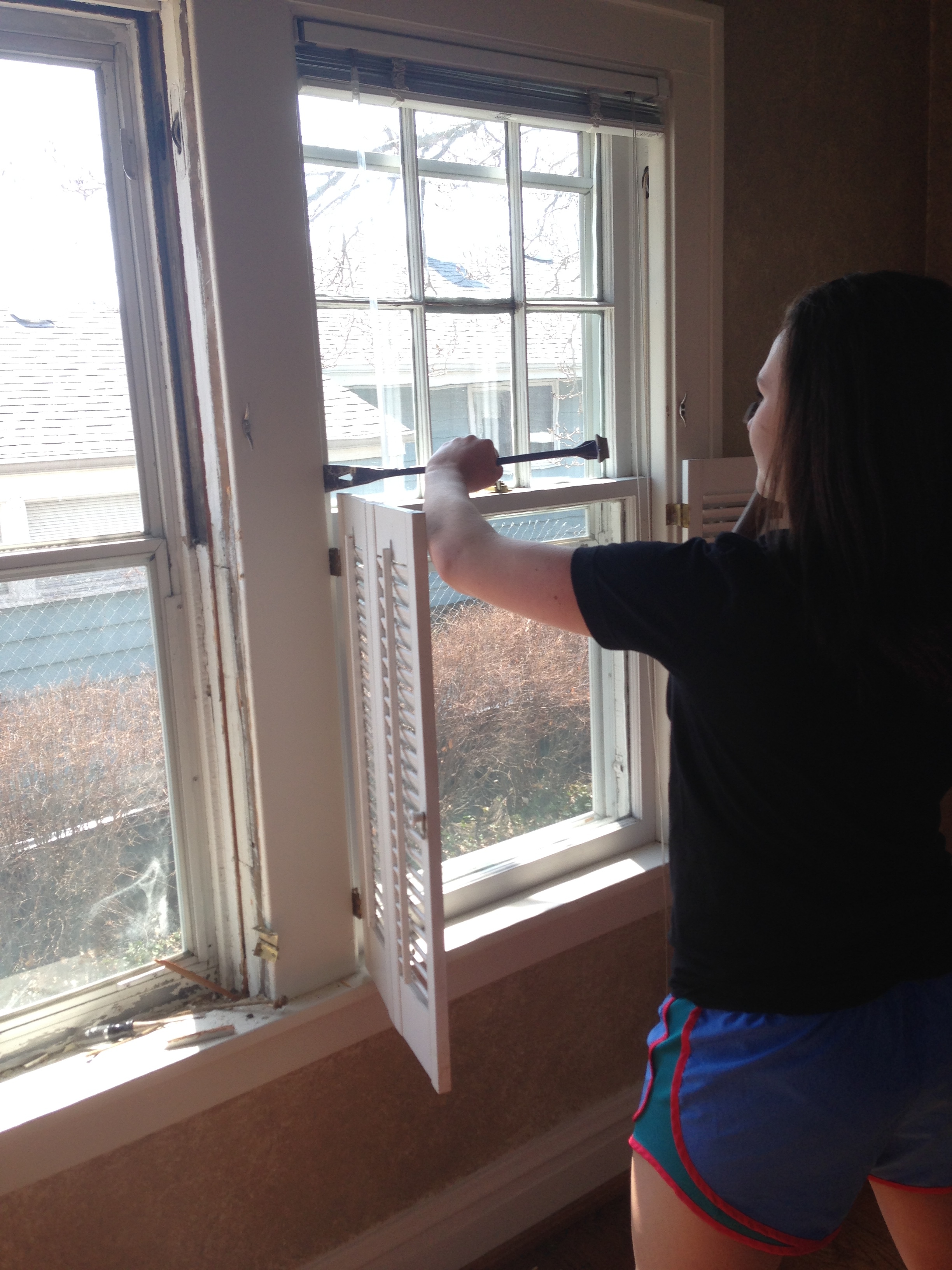 With the help of a pry bar and hammer – we took to the old wood frames and removed eight windows with six panes each. It seemed they would make a cool pair of French doors or something.