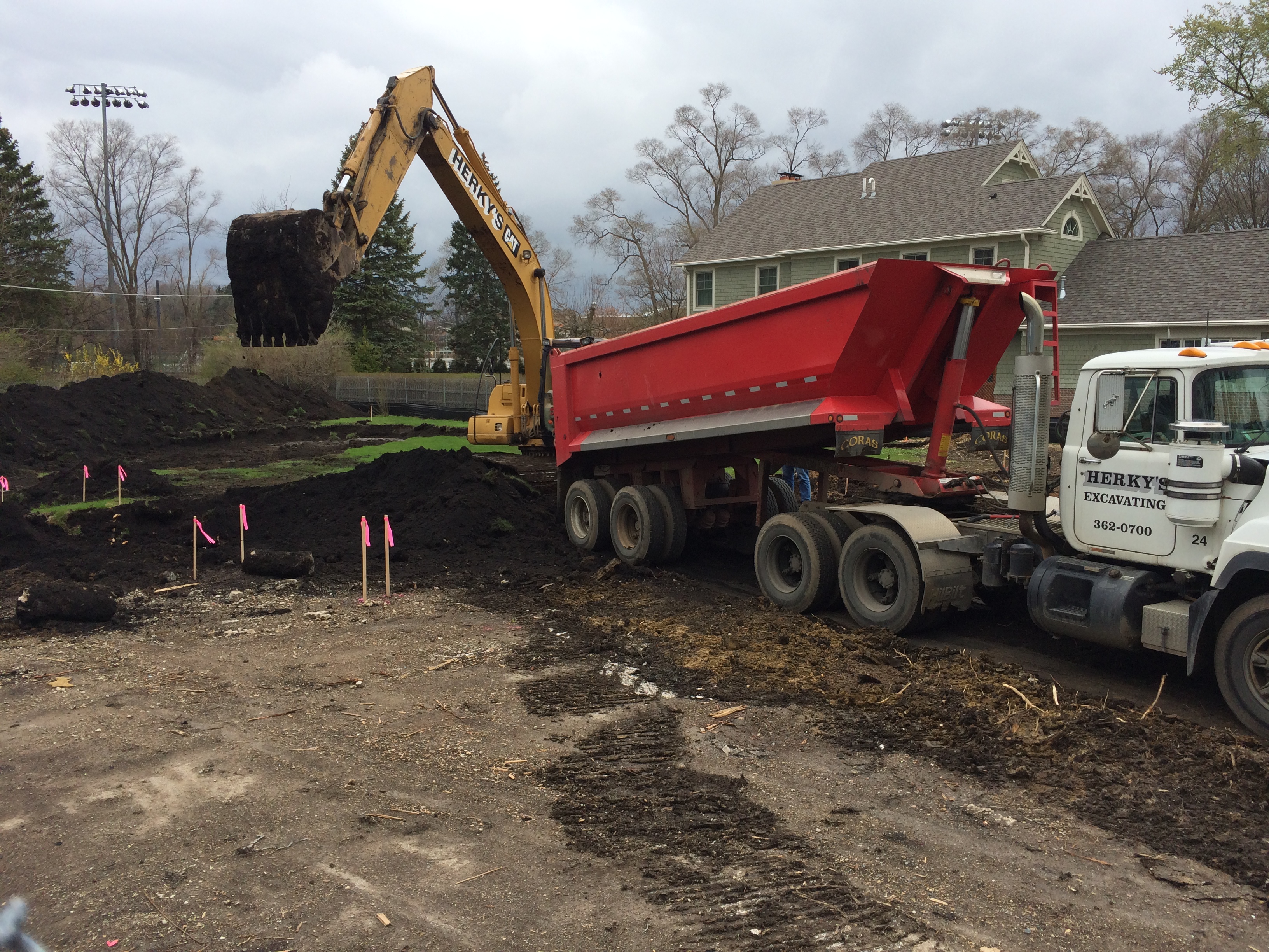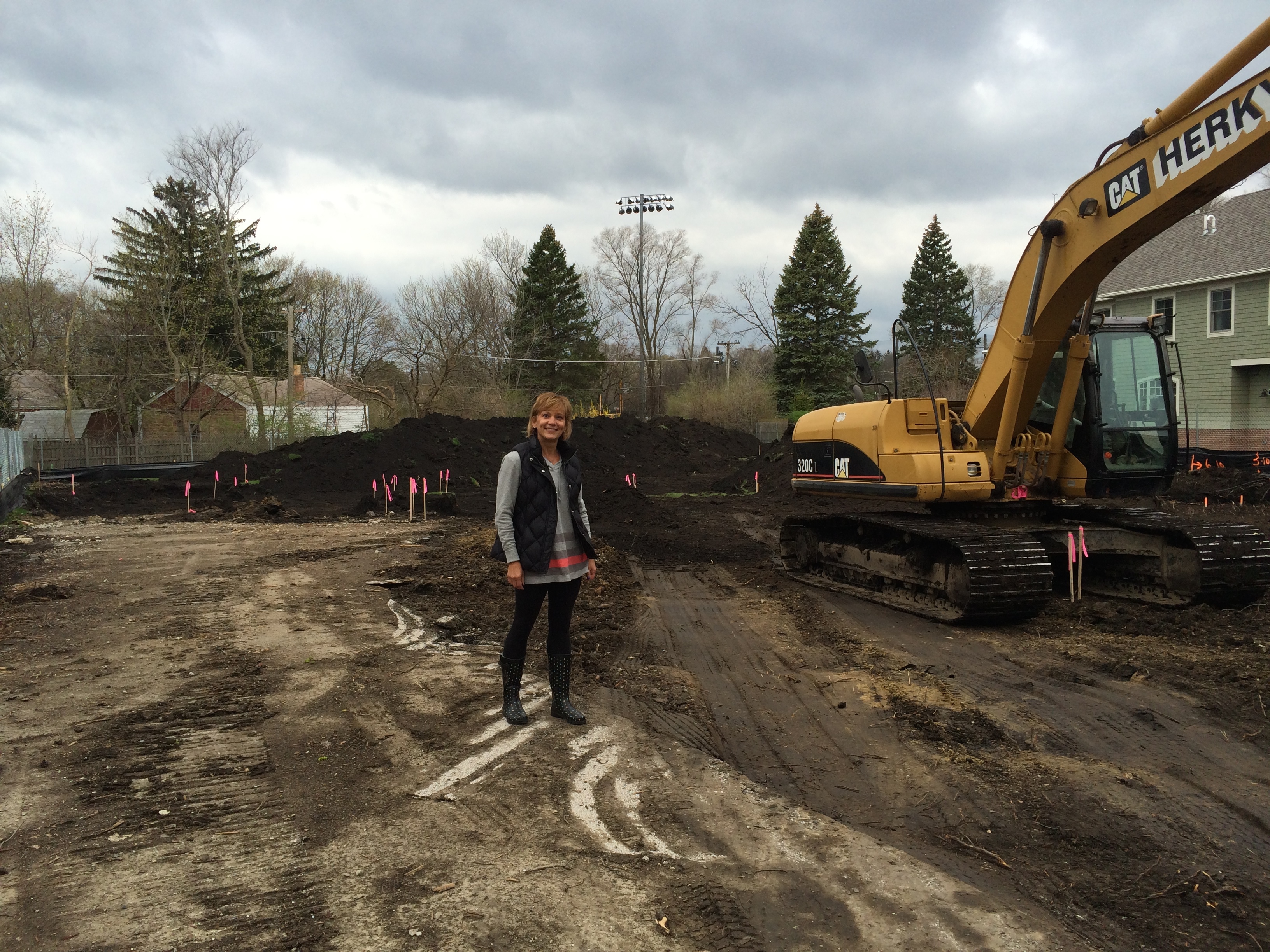 It’s a little hard to show what’s going on without getting “wet and muddy” but it looks like they’re either grading the lot or stealing our luscious, black topsoil. For whatever reason, they’ve scraped quite a bit from the rear of the lot. We thought they’d start by digging a deep hole but we’ll just need to trust that they know what they’re doing – haha.