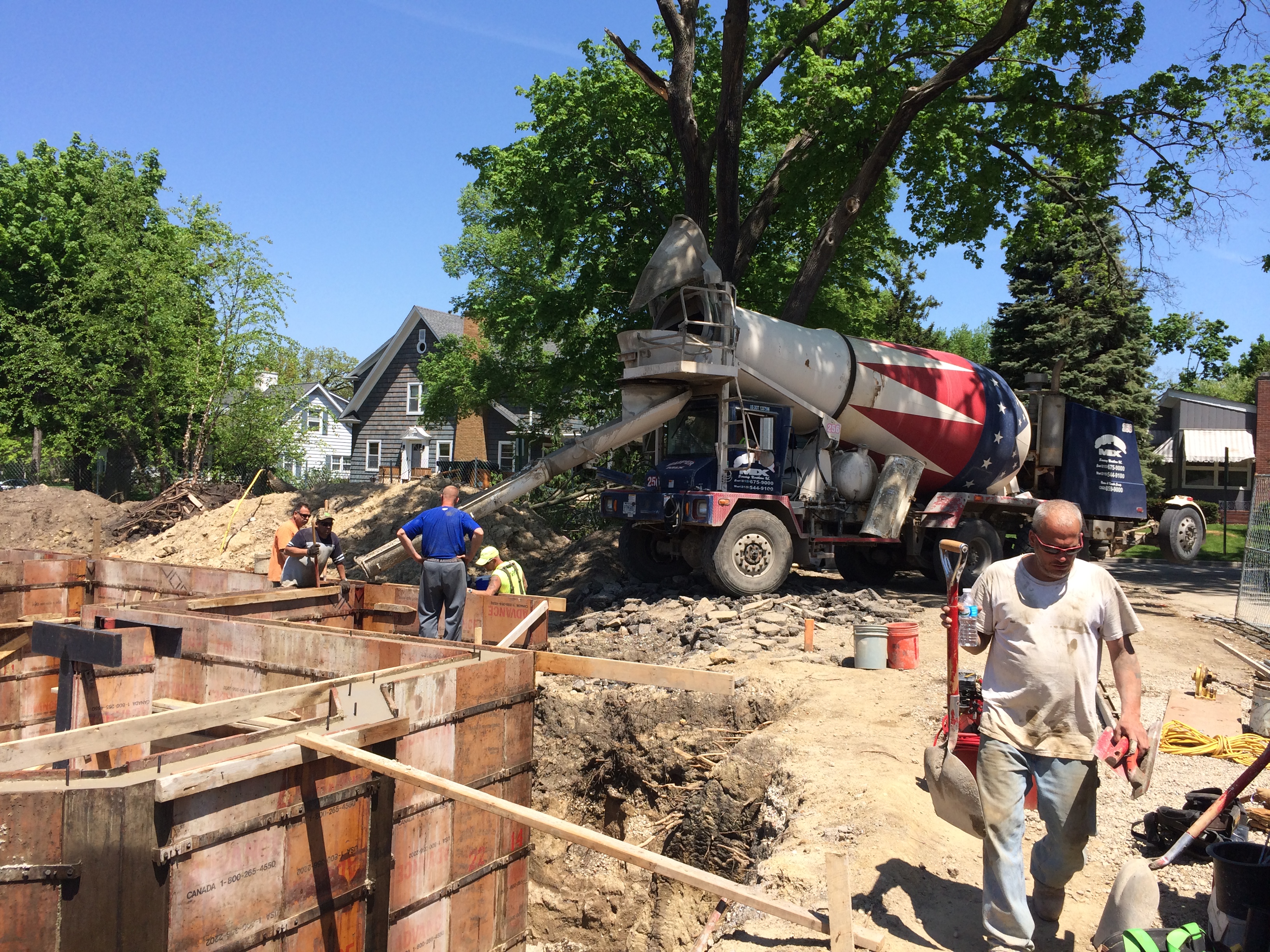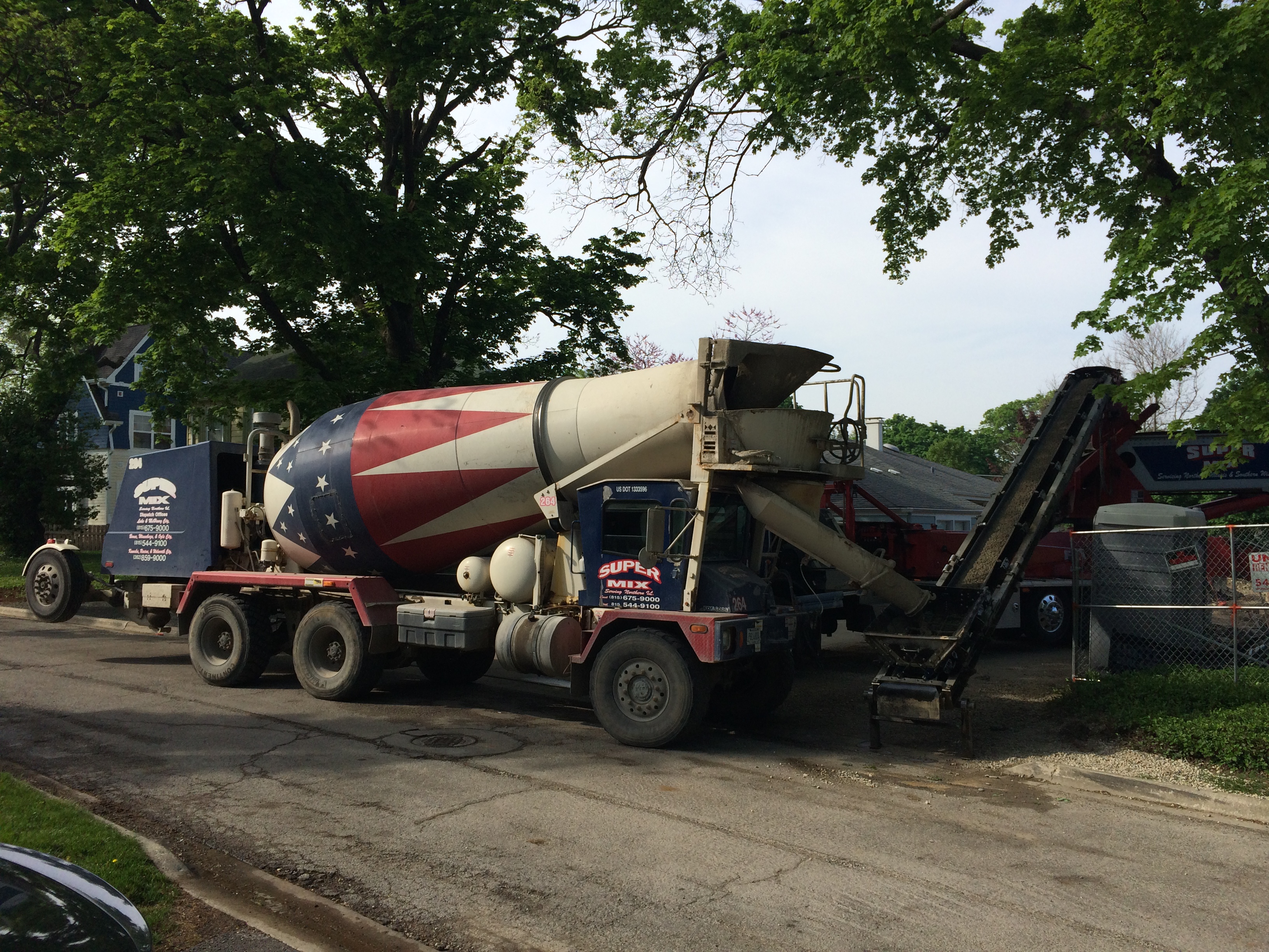 I dropped by the site on the way to work and saw the first of the cement trucks. One of the guys was directing traffic around the street, (the girls were told to turn off when they drove by on their way to school) and the boom truck was extended about 75 feet to the rear of the house.