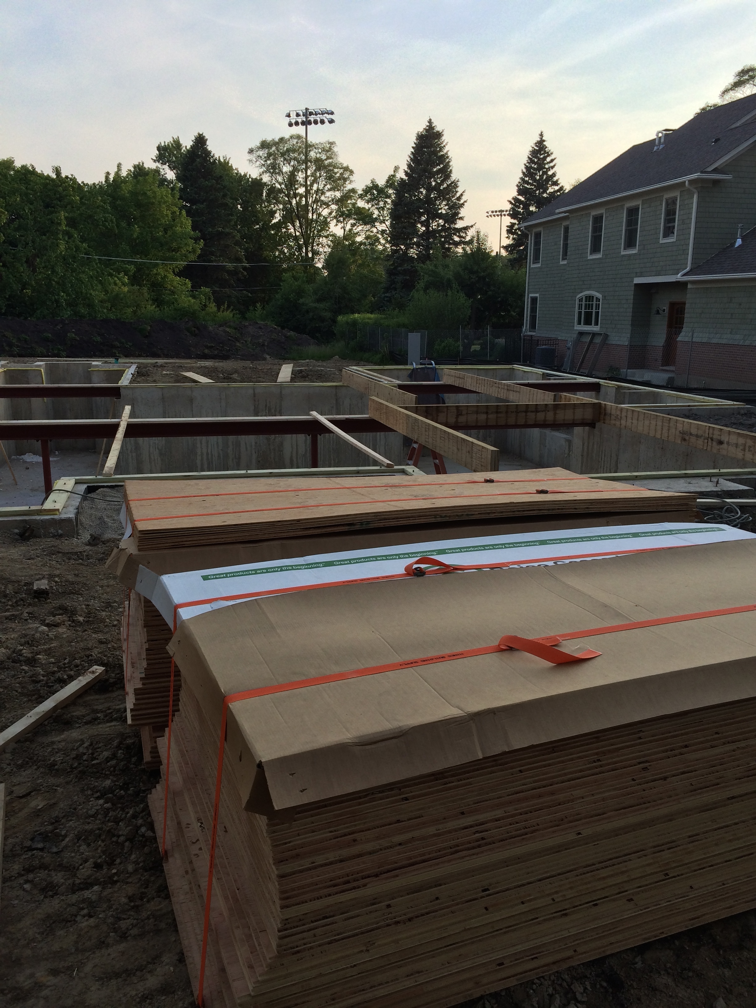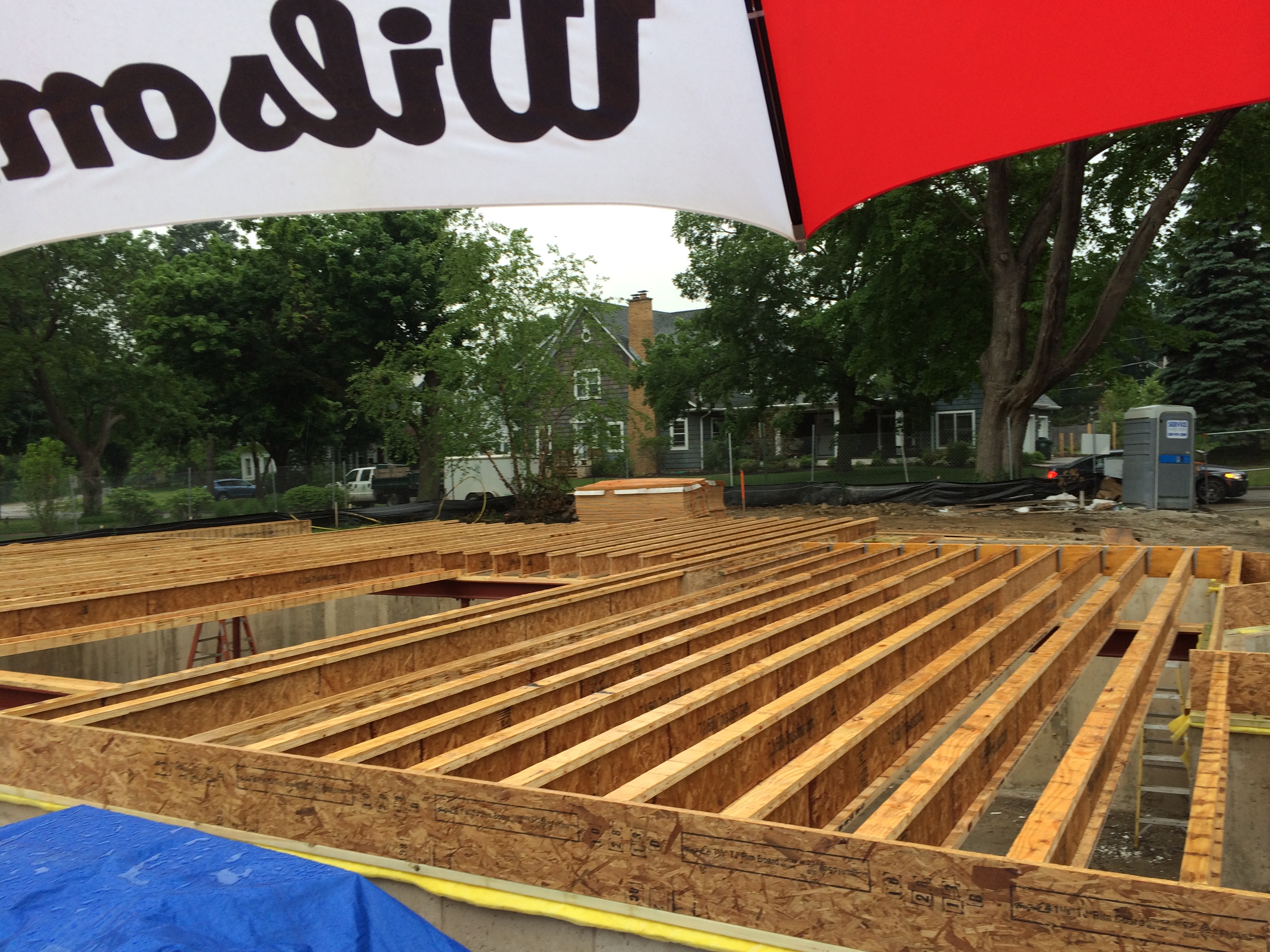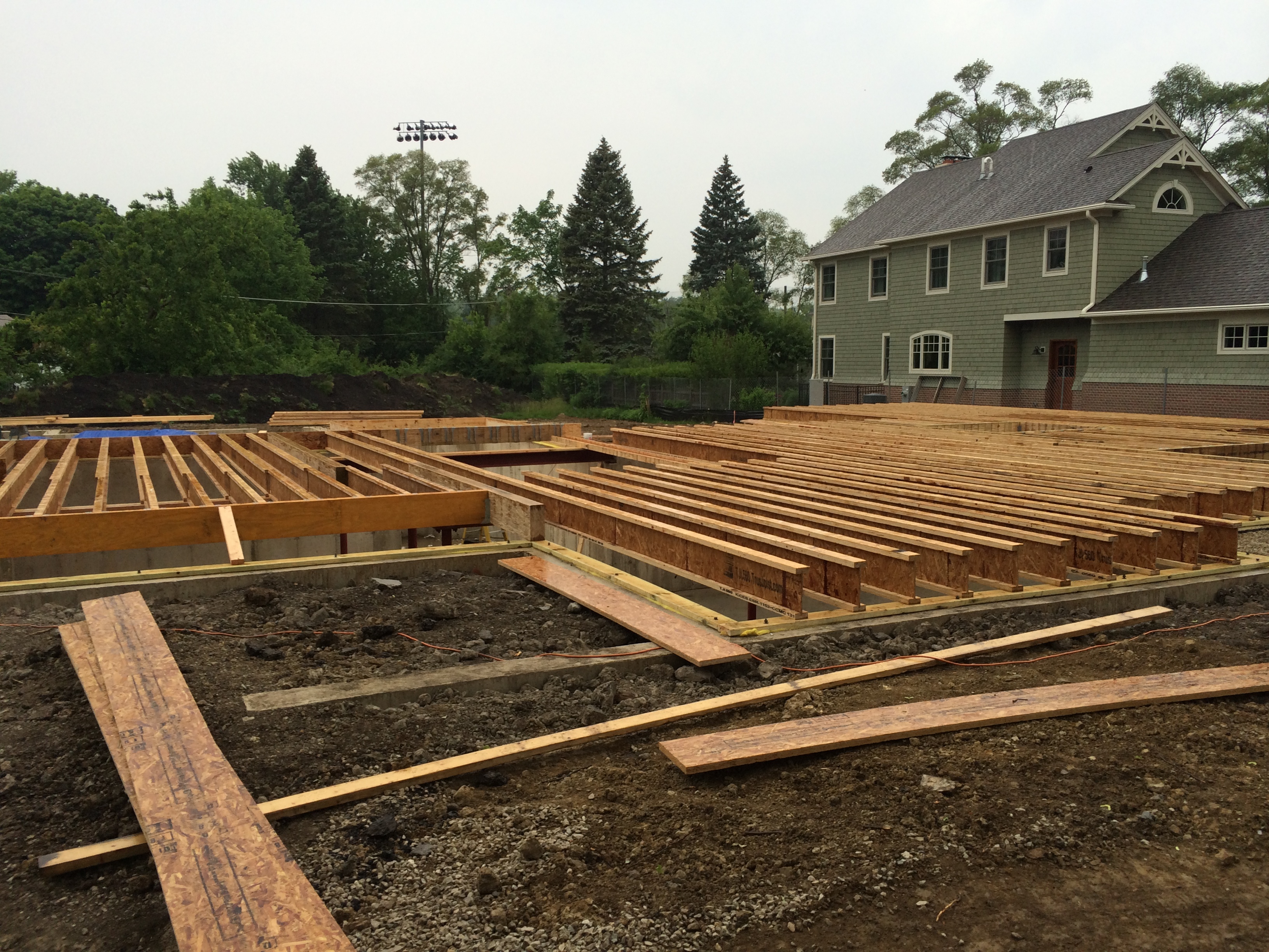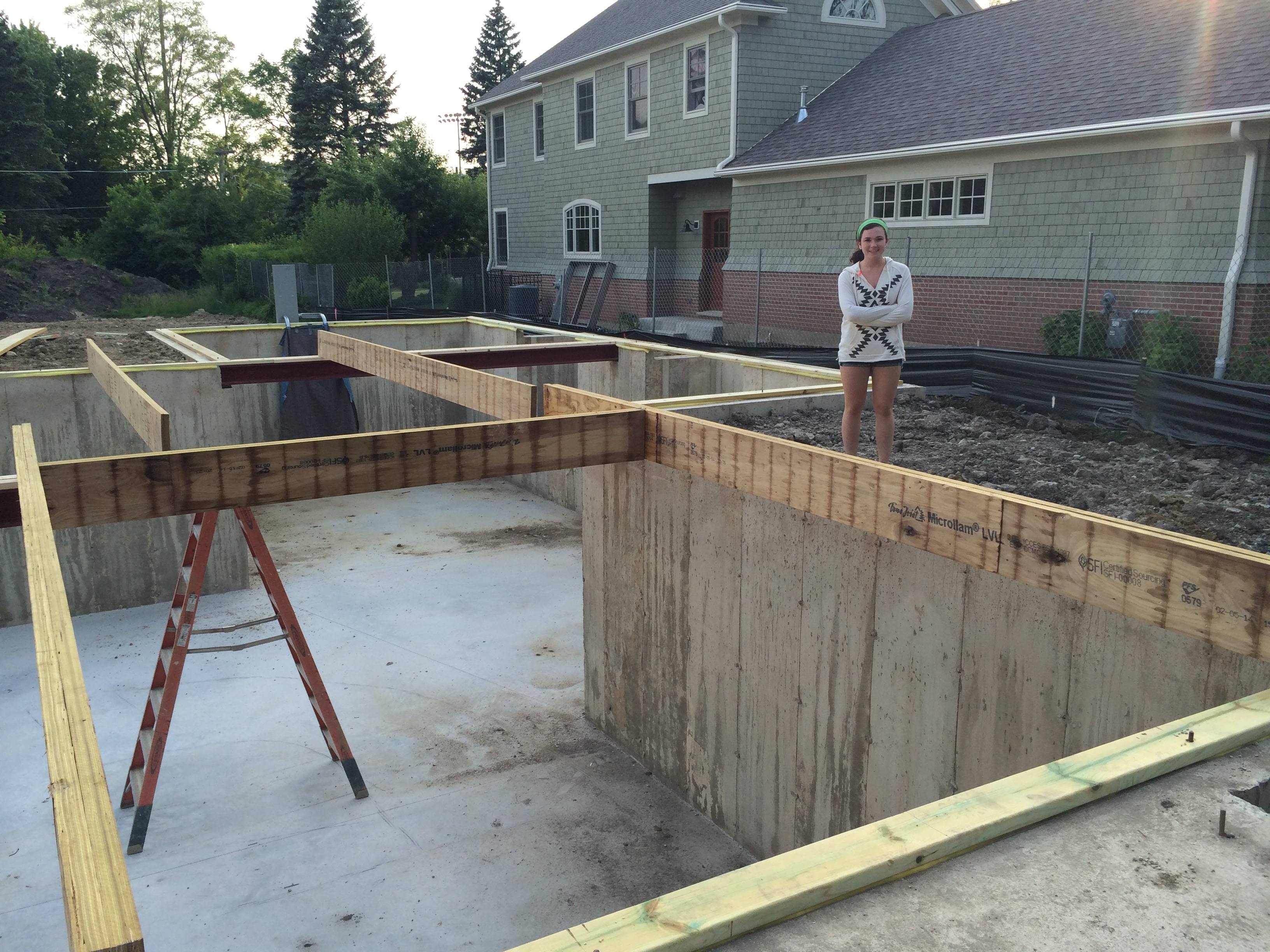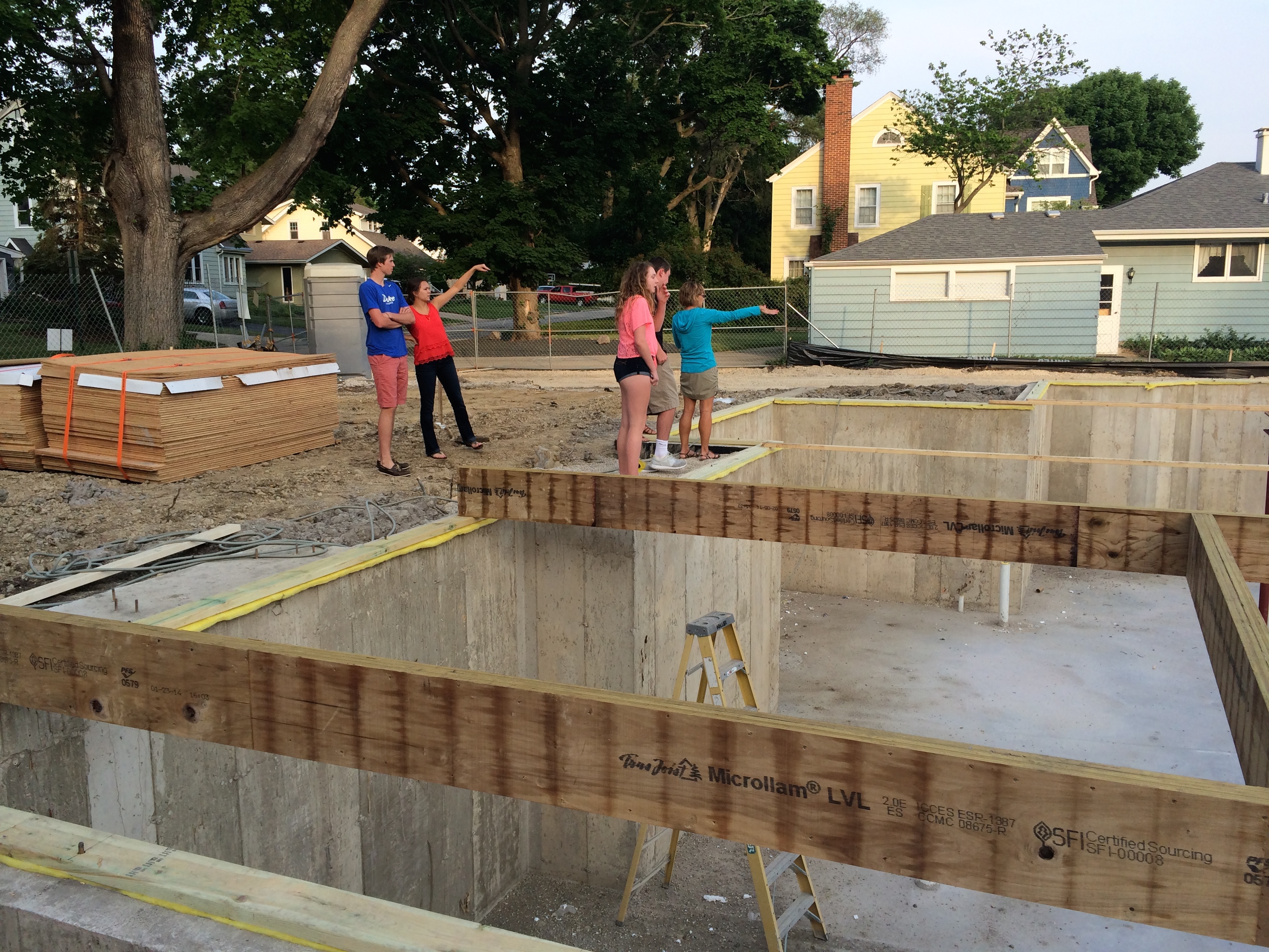 We also met today Ted…the Master Carpenter. In the photos below we can see here some of his handiwork – the floor joists and related mounting pieces. Renee was in town with Trey, Molly and Maggie who along with Maddie, Hannah and Jake came out to take a look at the work.