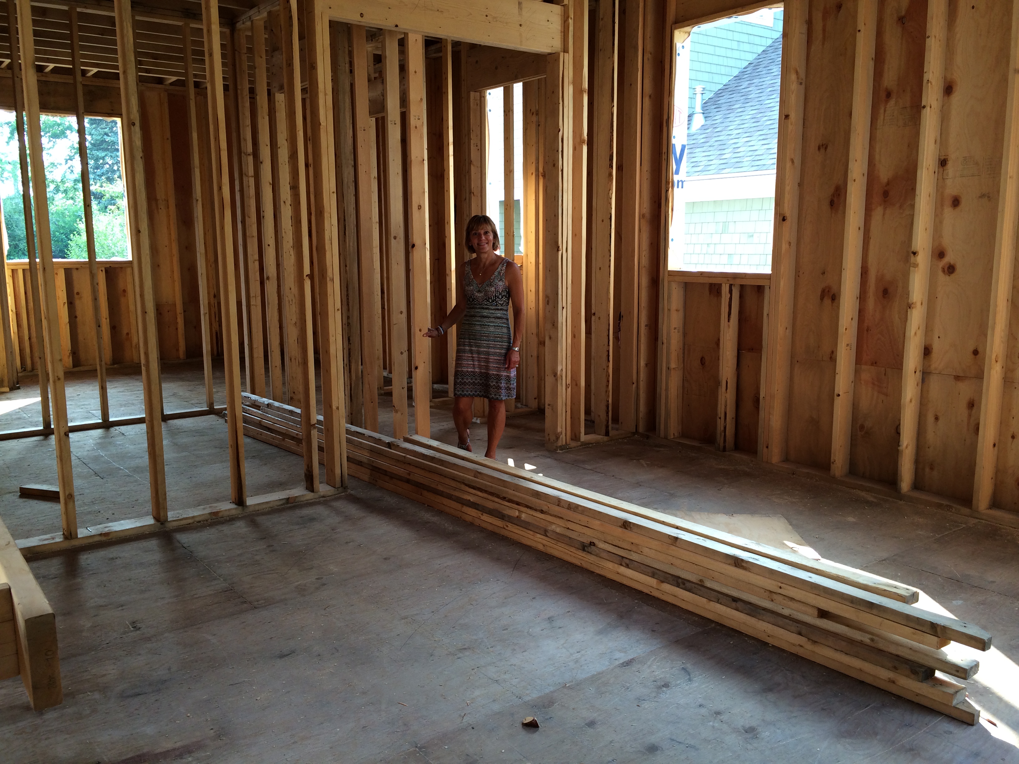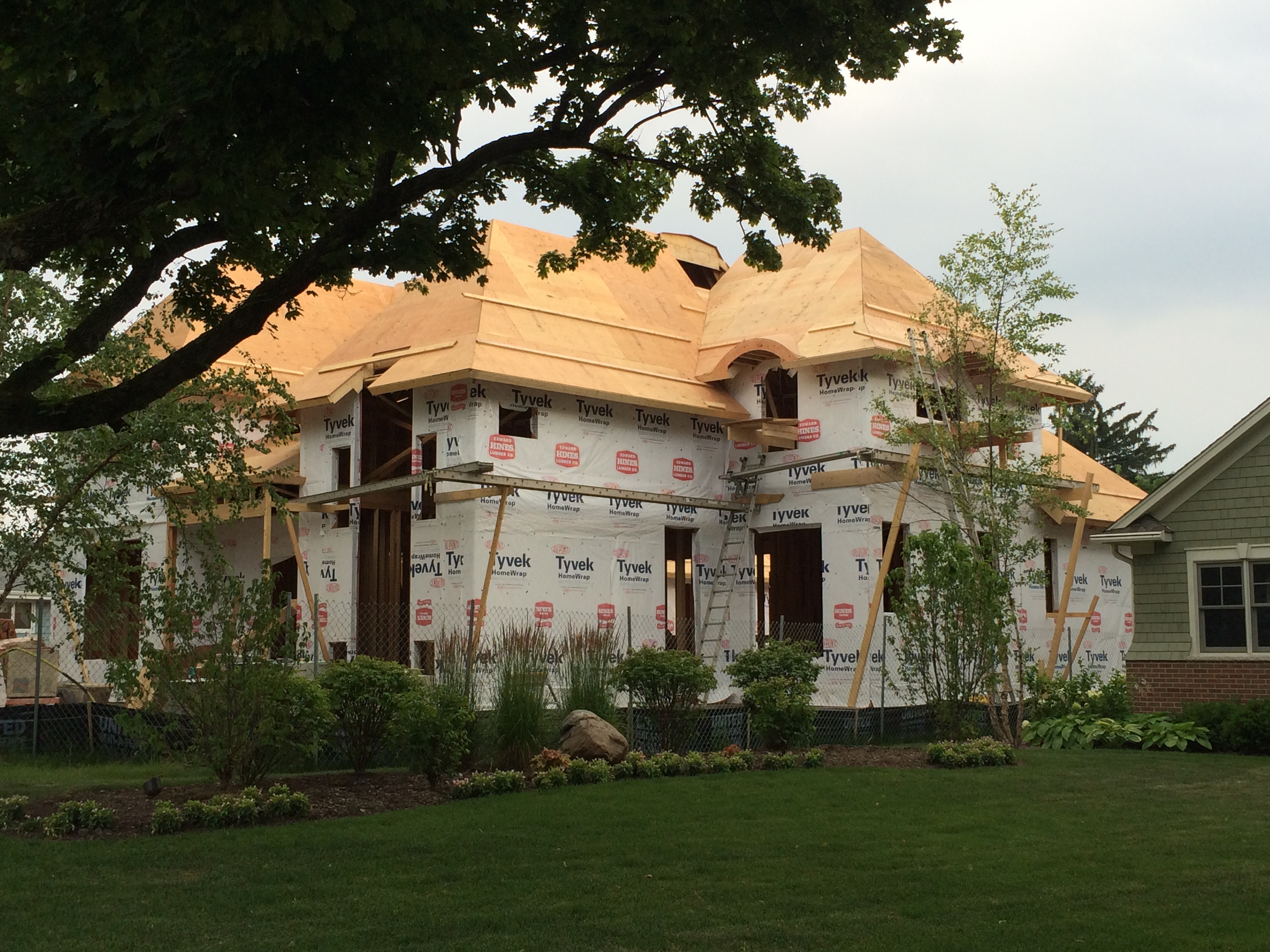 Ted and Jim were finishing the trickier parts of the roof (skylight between the loggia and 2-car garage) Mike and Brian were building the ceilings in Maddie’s room, the girls TV lounge and above the stairwell.  If all goes according to plan, Brad and the roofing crew will tomorrow start applying the tar paper.