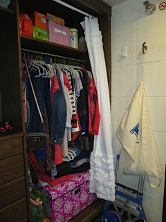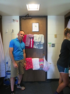 | Jeff being Jeff, posing in front of the girls bathroom towels… |