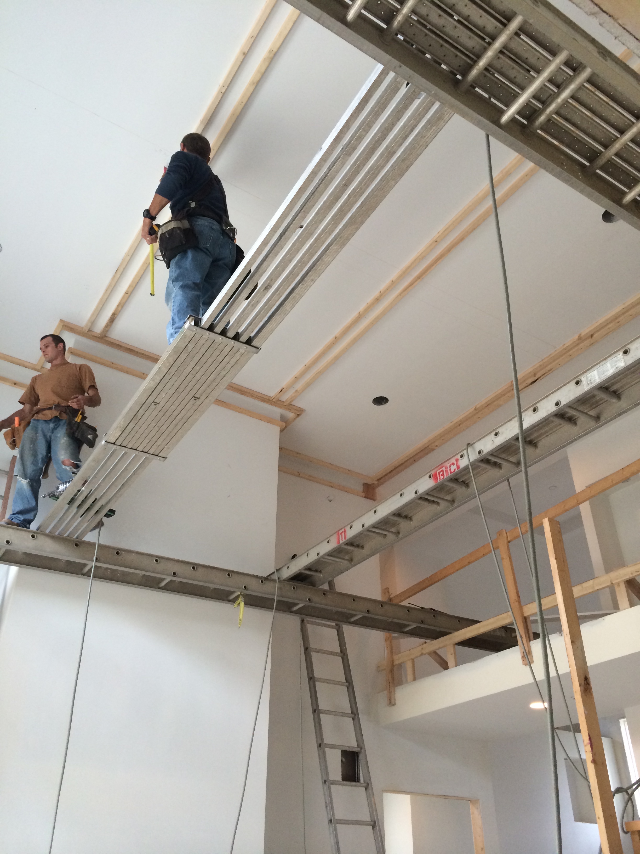 Just when Anne thought forward progress had ground to a near-halt…Ted, Mike, Brian and Craig (the carpenters) appeared Saturday again on the scene. Using their ladders and catwalks, they installed the beginnings of the beams in the Great Room.