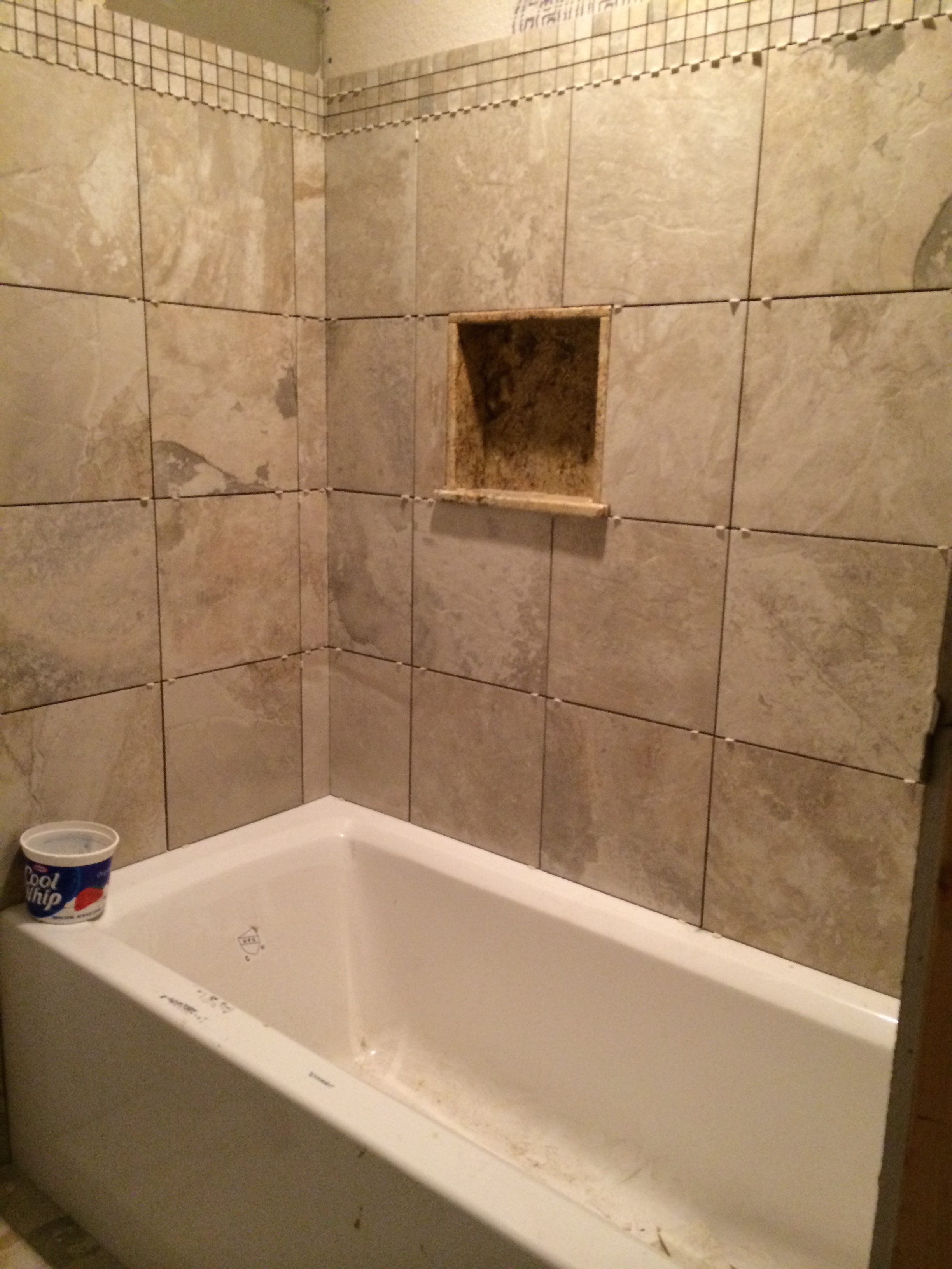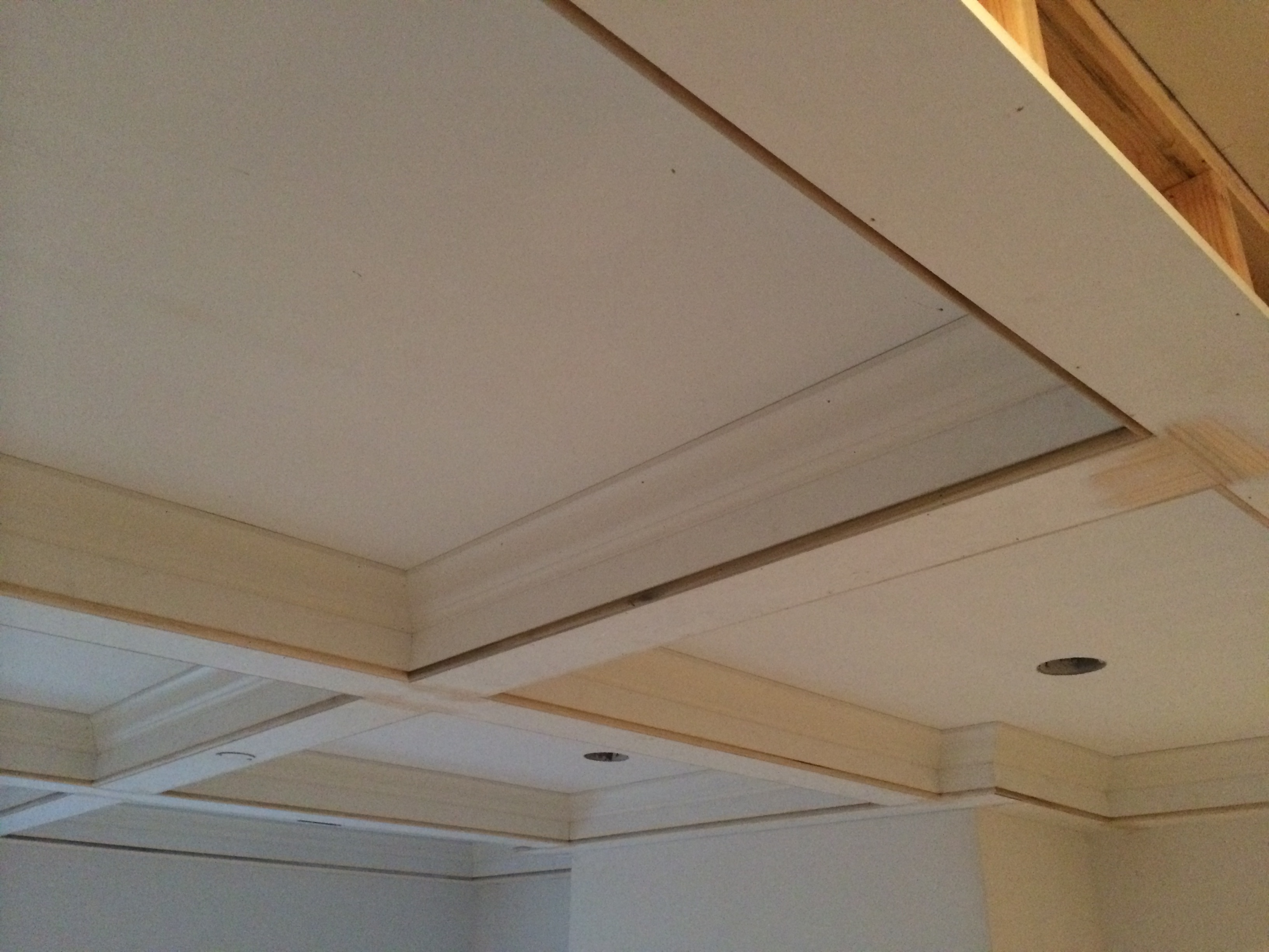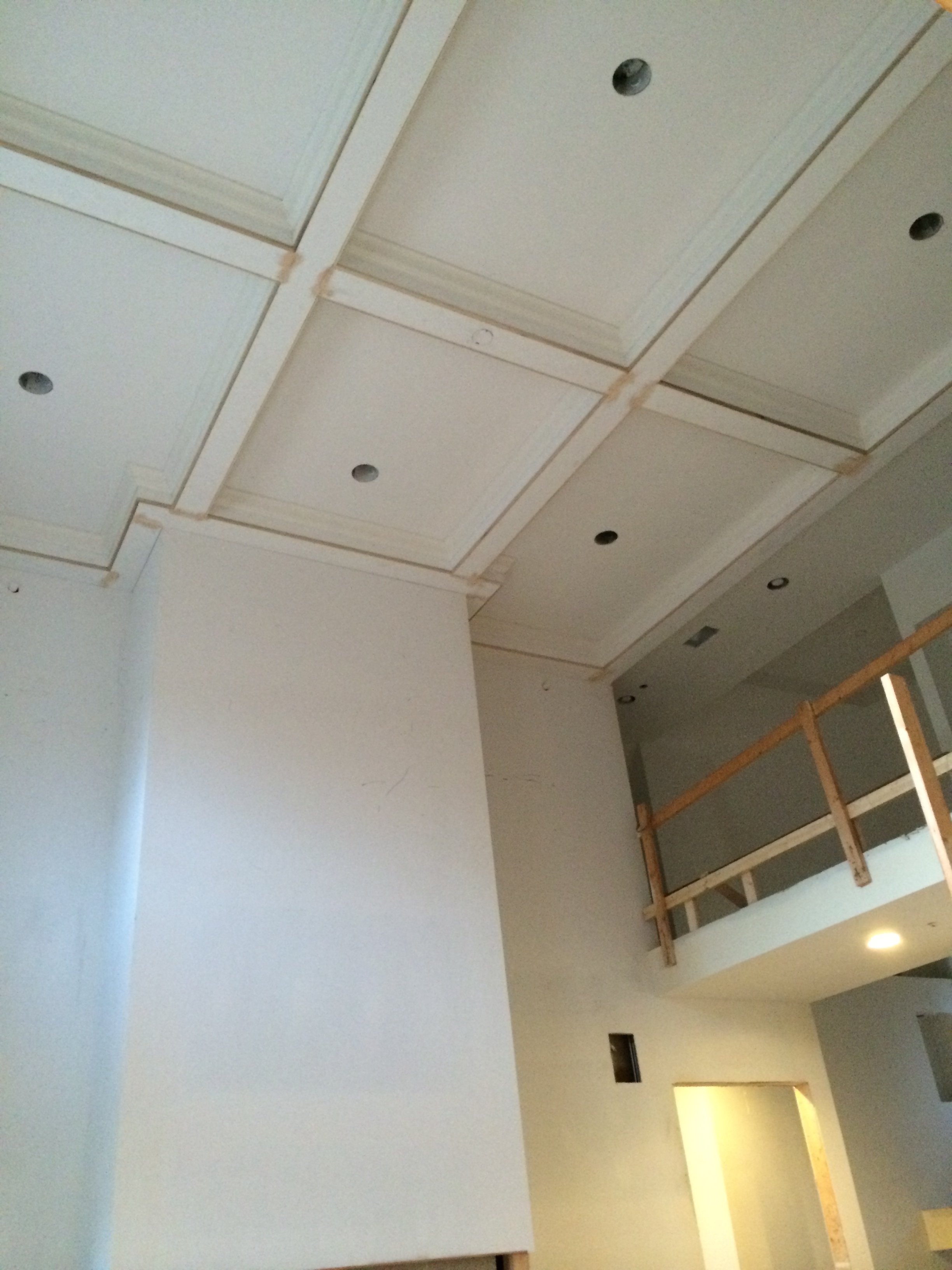 On the inside, Ted and Mike continued their work on the Great Room coffers while Jim and John tiled the master shower, Maddie’s shower and grouted the laundry room. Funny story – Rick won’t bring back a dumpster until the driveway is paved and the guys are getting a little tense about where to put the garbage/scraps. These guys have to be the neatest contractors ever!