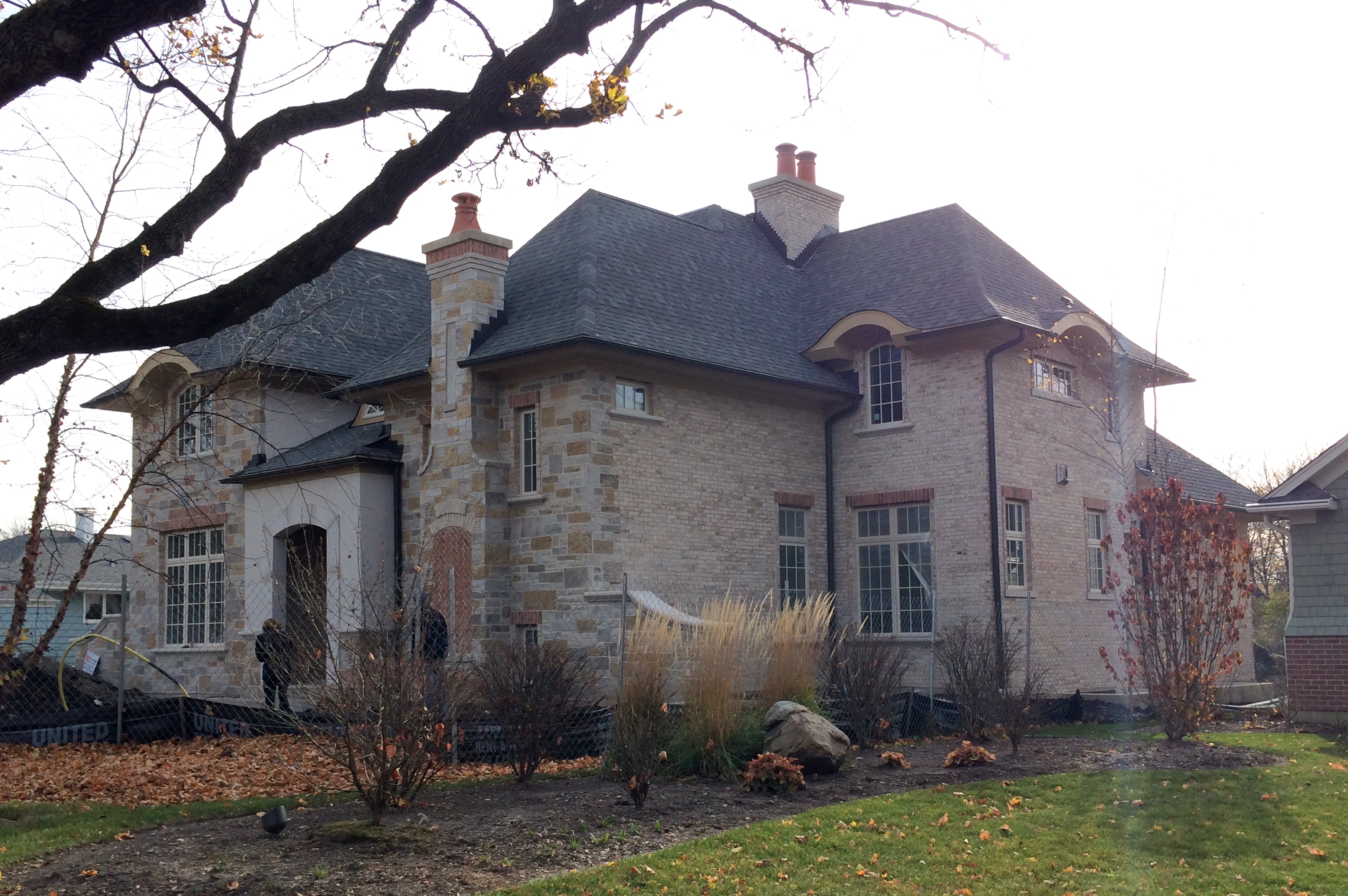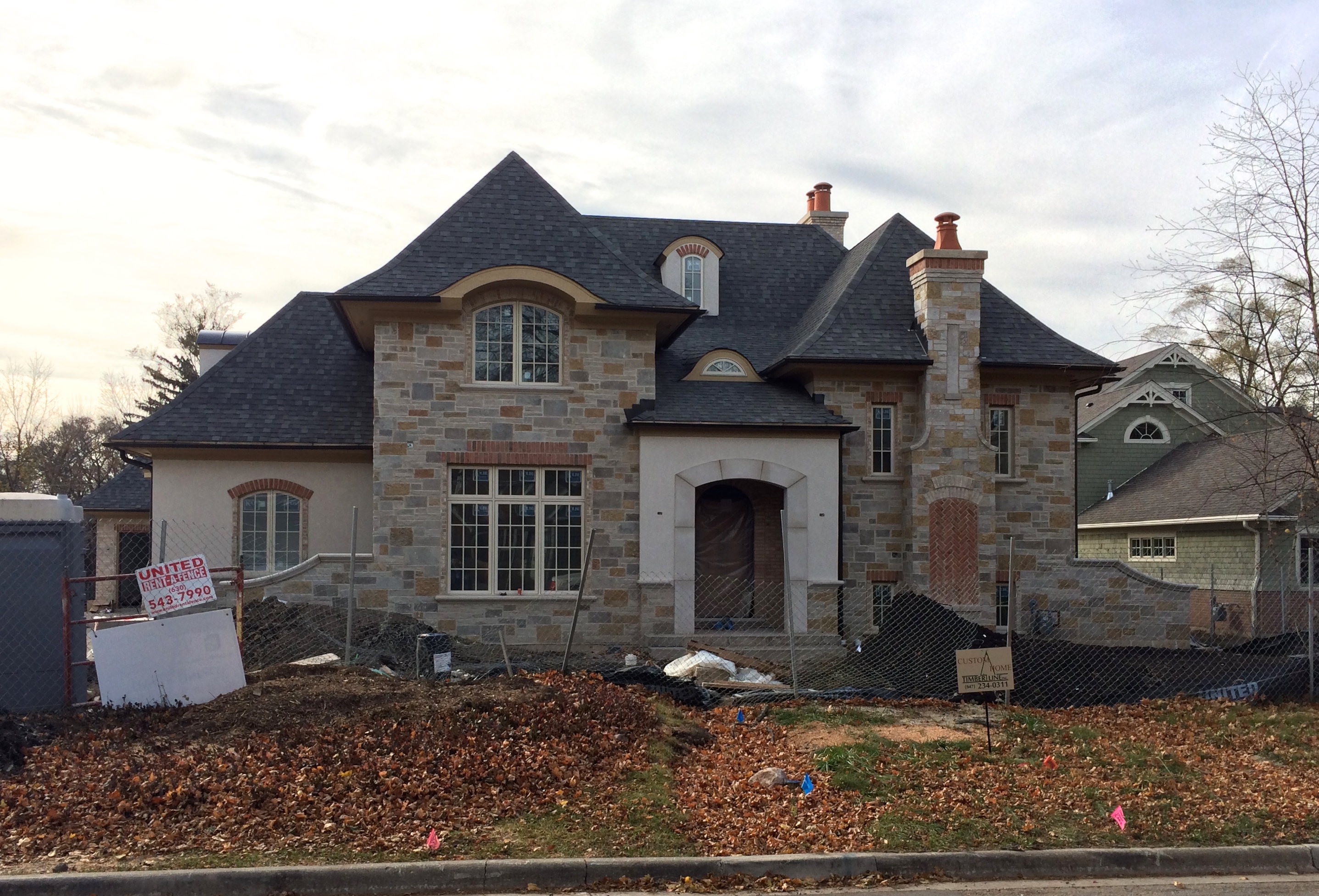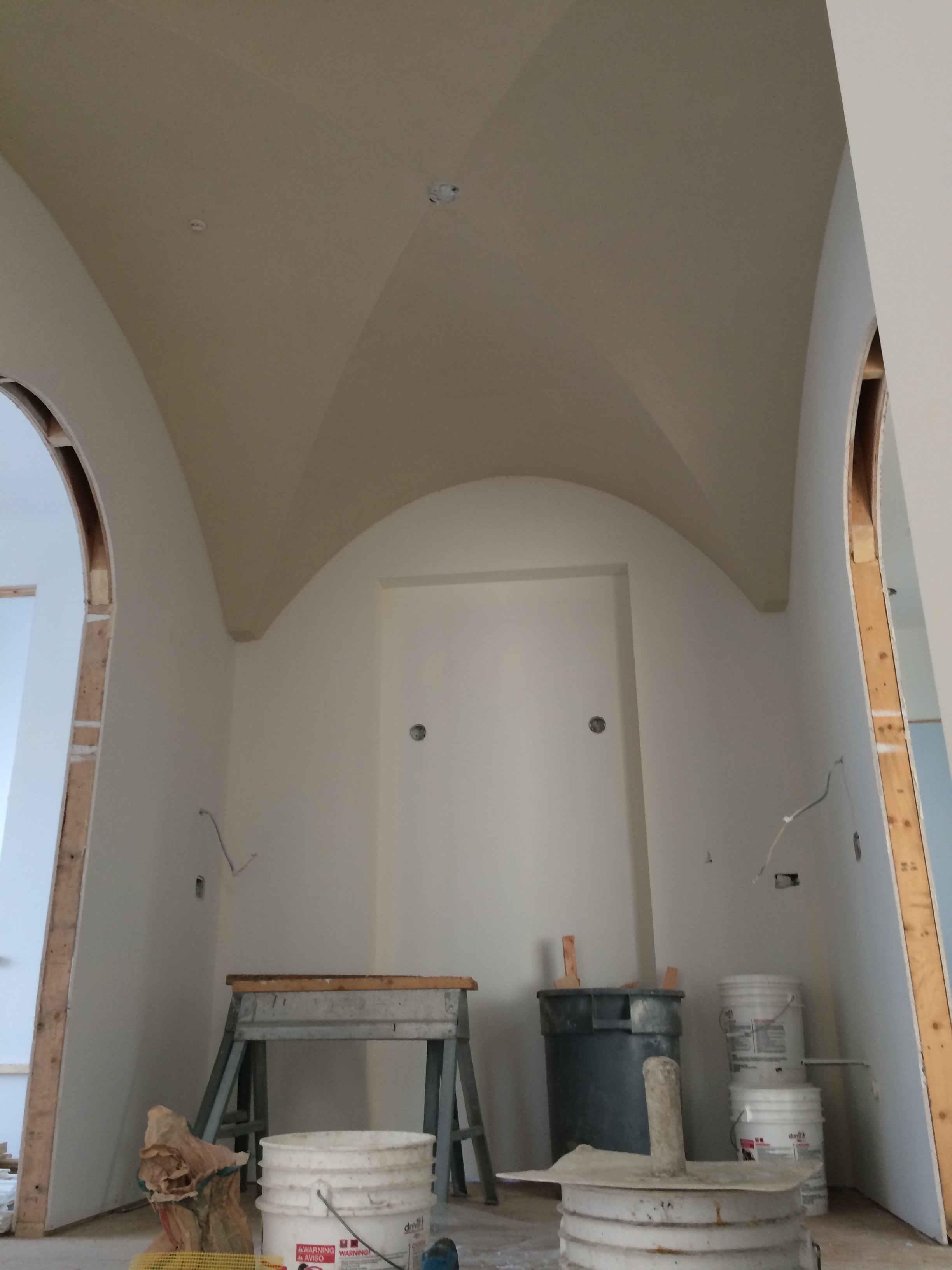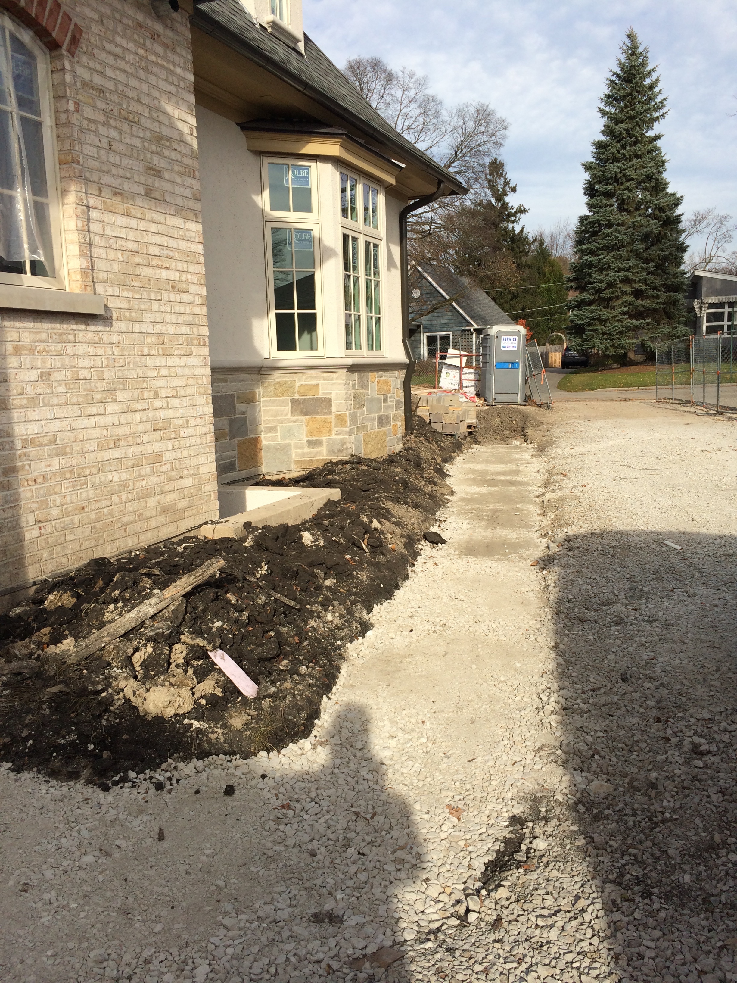The gutters were finished, the first row of the driveway retaining wall was laid, another layer of stucco and the arch in the bazaar were added, some shower tiles were installed and case molding for the windows/doors was delivered.