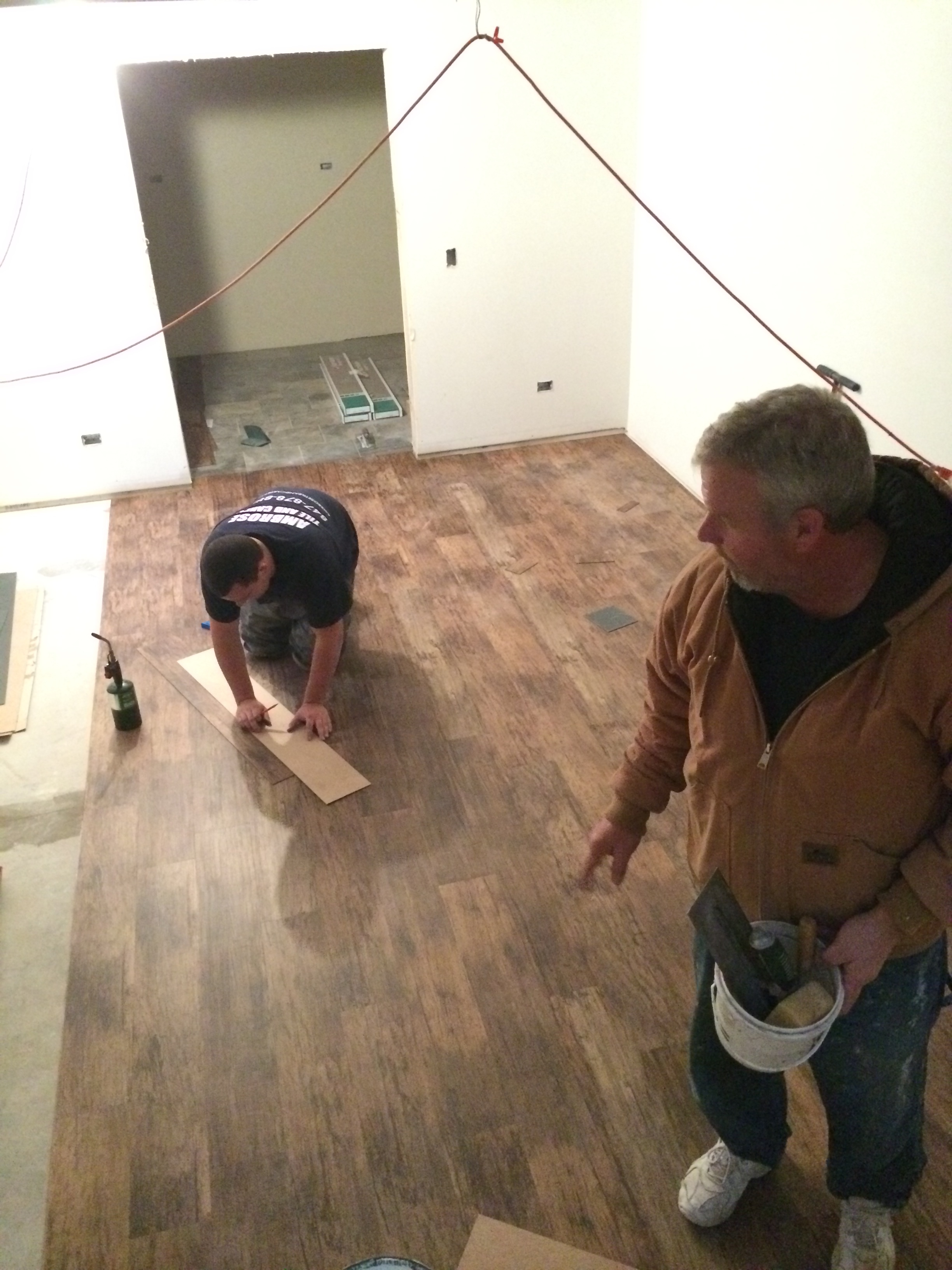 Mike, Chris and Brian all came down with a Tuesday Flu – calling in sick – but have been trimming everything they can until the flooring guys are done with the main floor. Speaking of floors, John was finishing today the wine lounge.