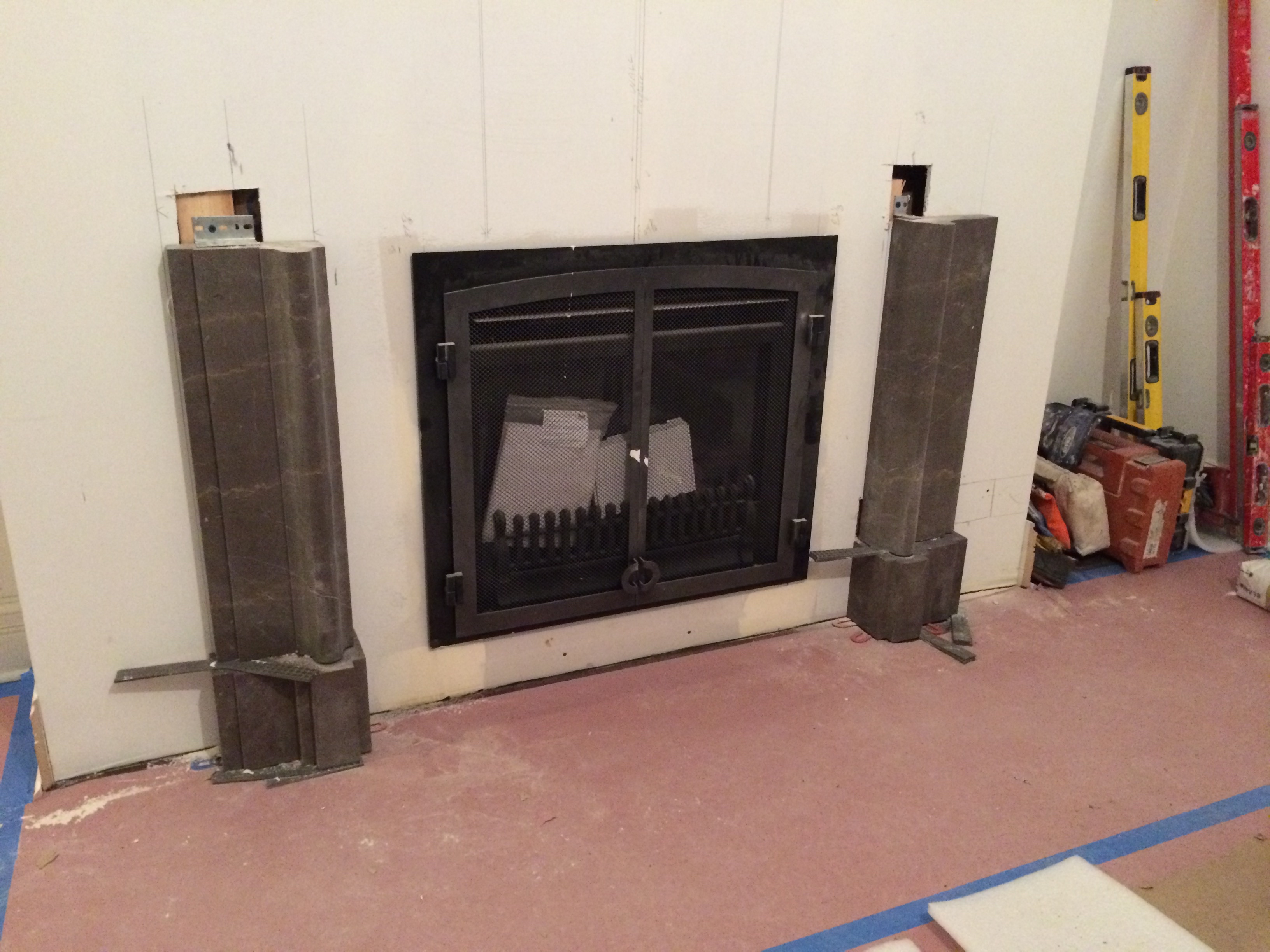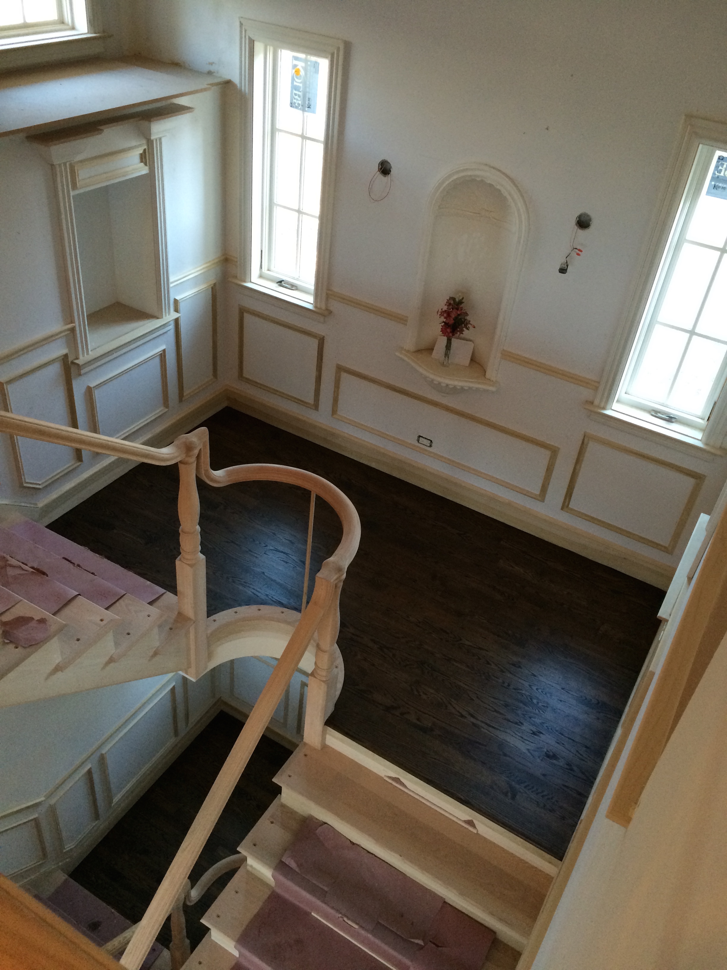No sooner did the varnish dry than did appear Tom/Andrew to install the fireplaces and (of course) Mike and Chris…the carpenters extraordinaire to install baseboards and other trim put on hold pending the floor finishing. Vlad and his team of Polish Painters also arrived with tape and paper mask in hand…prepping the first floor for paint.