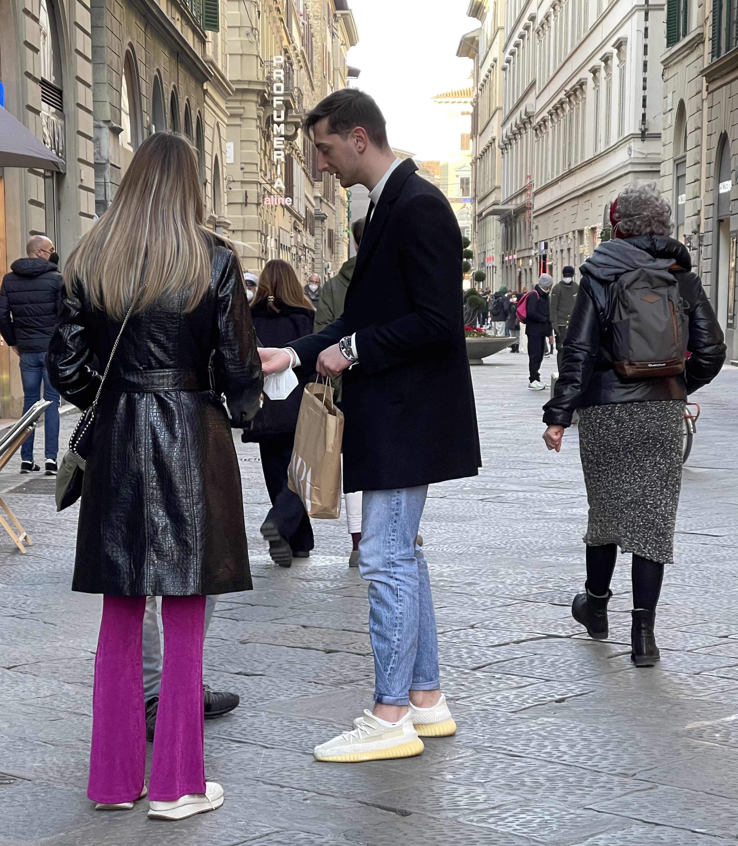I was very happy to see on this fellow that pegged-pants are making a fashionable comeback. My joy turned quickly into despair when this fashion trendsetter engaged a filthy, schlock-peddling street merchant. Still, I prefer white socks over exposed ankles.Thanks for reading! Salute! Grazie Mille! Ciao! Arrivederci!