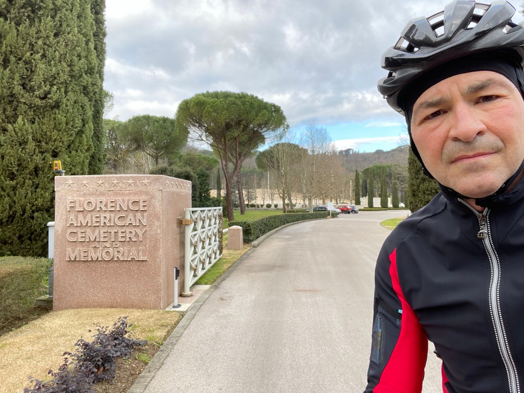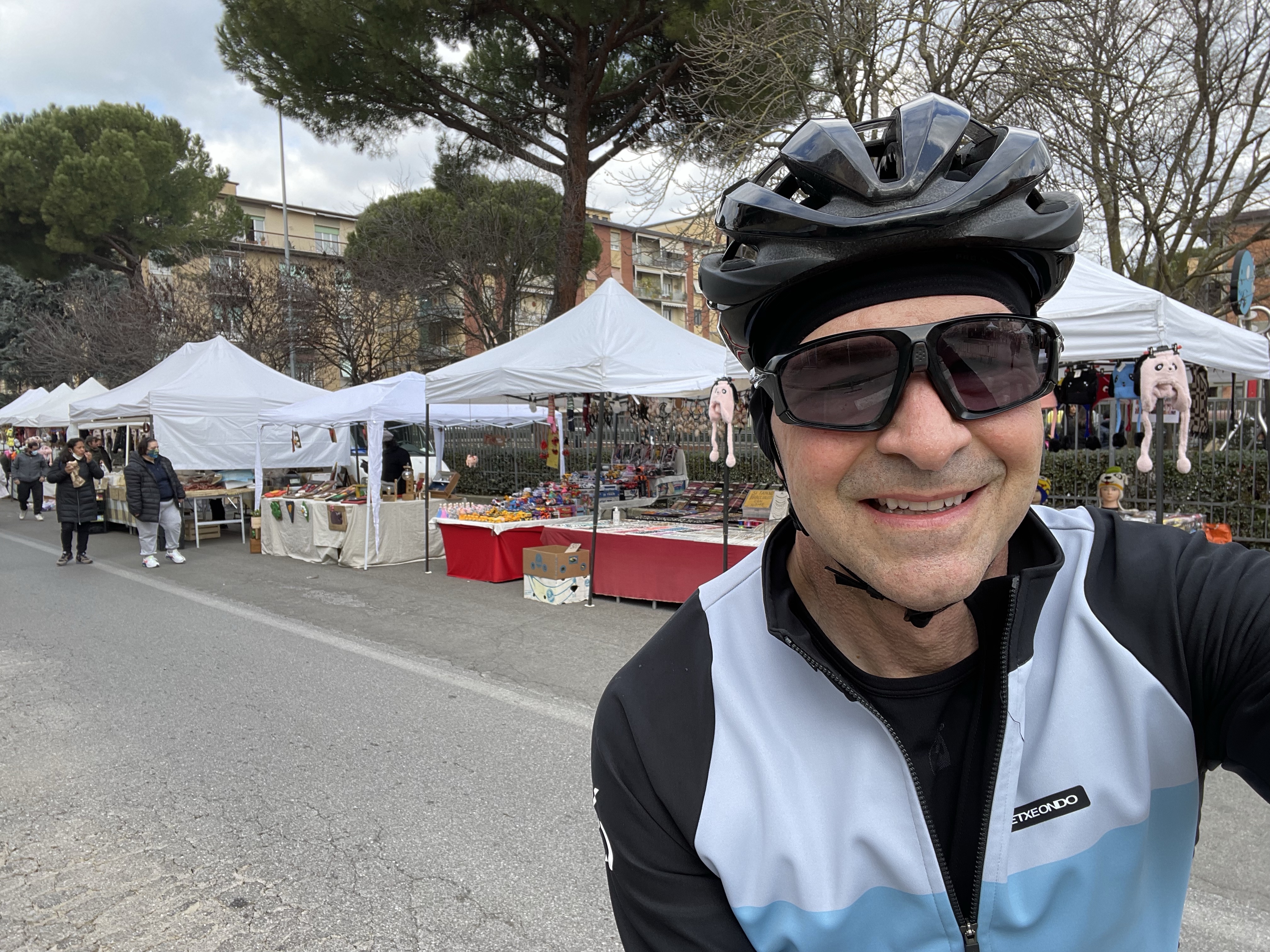 I saw some cool things on my rides this week, too as captured above. Out of nowhere appeared the American WW2 cemetery… just 7-8 miles from Firenze Centro. I don’t recall ever reading about the battles fought here resultingin US casualties, but here’s the aftermath. It’s a small, but moving monument to the Greatest Generation – funny how these types of things transcend politics. The landscapes throughout Chianti never get old and one route that I took was loaded with ‘Castelli’; every hilltop seemingly had one. I’ve also noticed in many different places that vineyards/olive groves burn their pruned cuttings… likely a seasonal thing. I’m def not riding in CA anymore, Toto. BTW – that empty pack of smokes on the ground just confirmed that other cyclists have paused their rides at the same scenic overlook as did I to click a few pics. The last pic is me at a Sunday market… almost every town on Sunday has women gathering at Piazza’s to buy stuff or men loitering outside cafes to drink cafes.