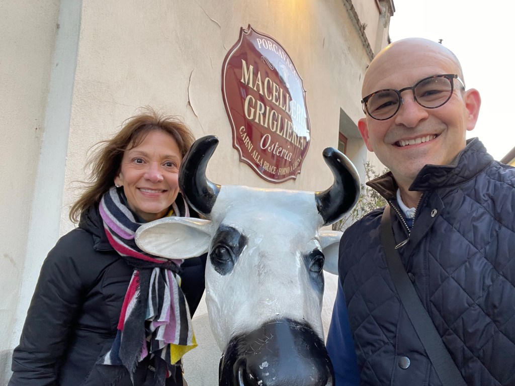 The above pics are form Abrezzo. We took a day trip about an hour out of town and LOVED finding a touristy-friendly lunch in the sun of Grand Piazza. The Warm Sun being the key driver of our selection. Abrezzo’s merchants largely had closed up shop for the winter but we loved the quiet – and for a town historically fought over by the wealthy, warring cities of Firenze and Siena… the humble folks in Abrezzo have built a lovely and protective wall, towering Duomo and bustling centro zone all around the 1000 year-old structure left by the Romans. Oh yeah… the Abrozzo residents love beef. The cow ironically welcomes diners to a restaurant featuring delicacies made from said beef. Yum or Yuck??