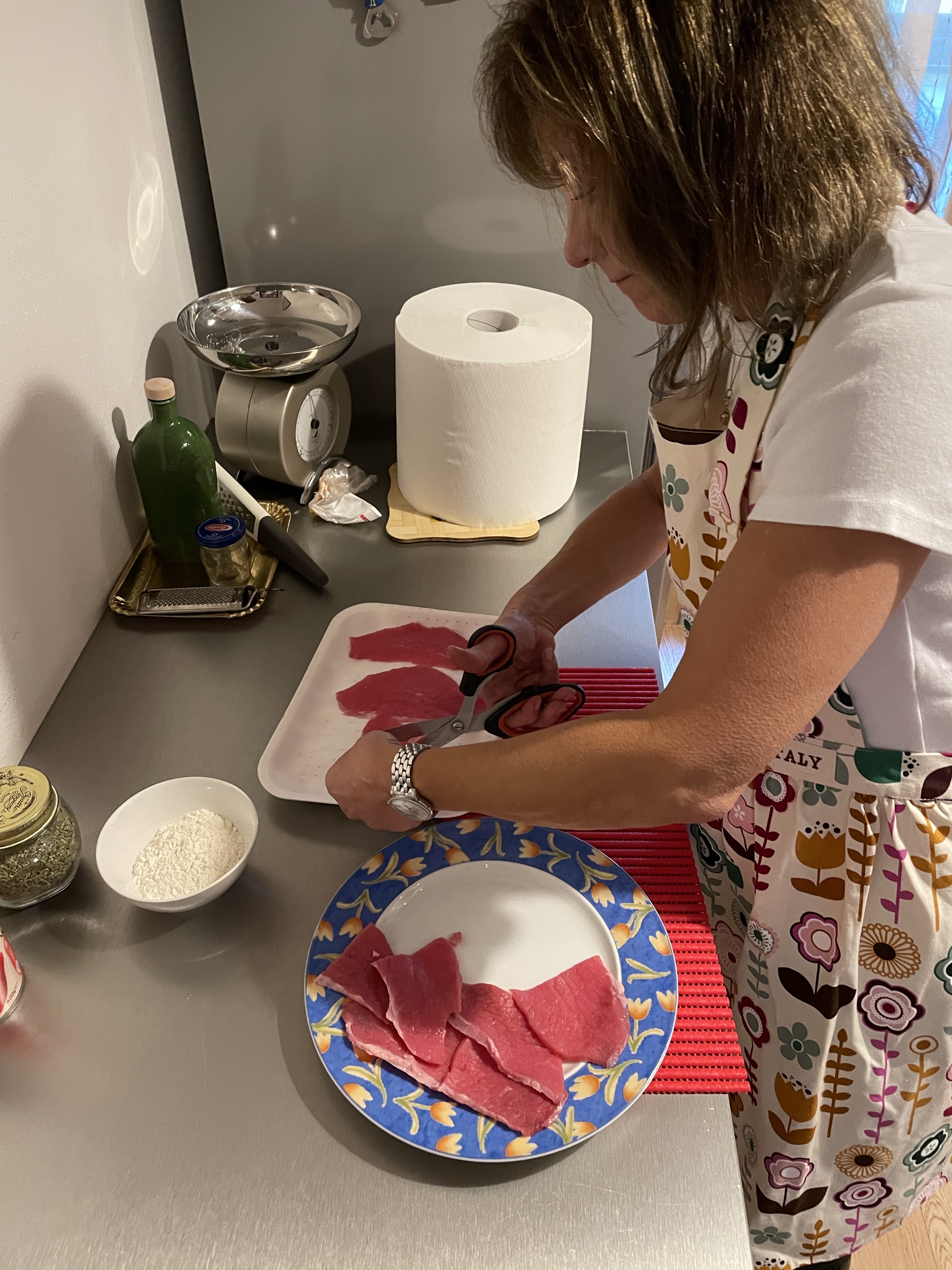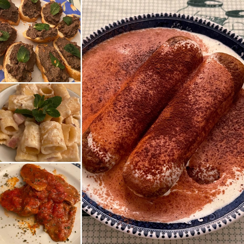 Our 4-course dinner “alla Simona” collage: Crostini Neri, Pasta al Forno with Bechamel & Cured Ham, Veal Cutlets with red sauce and … ‘Santo’ Tiramisu. (Editor’s Note: Simona would normally let those sweet and creamy dessert bowls ‘age’ in the fridge for three days before serving… there was no way that was gonna happen.)