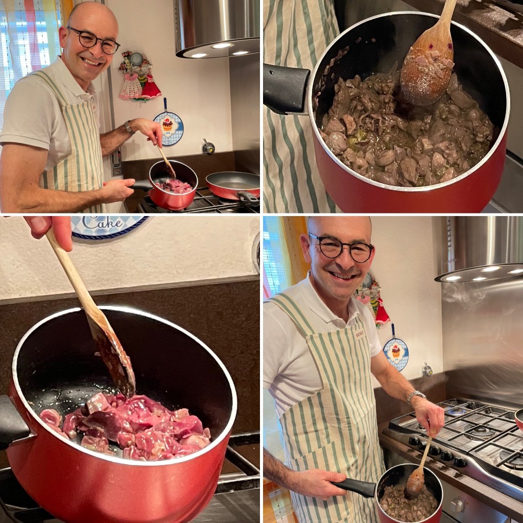 One of the most popular regional Tuscan dishes is Crostini Neri. It’s in every restaurant on the Anti Pasti menu. It’s chicken livers… cooked with onion, capers, anchovies, wine, salt and olive oil and then blended in a food processor. There are a lot of variations on the recipe according to tastes and traditions … but dang… those livers take a long time to cook. I’d guess 20 minutes have elapsed between photos; I’m pretty sure it removing the cholesterol.