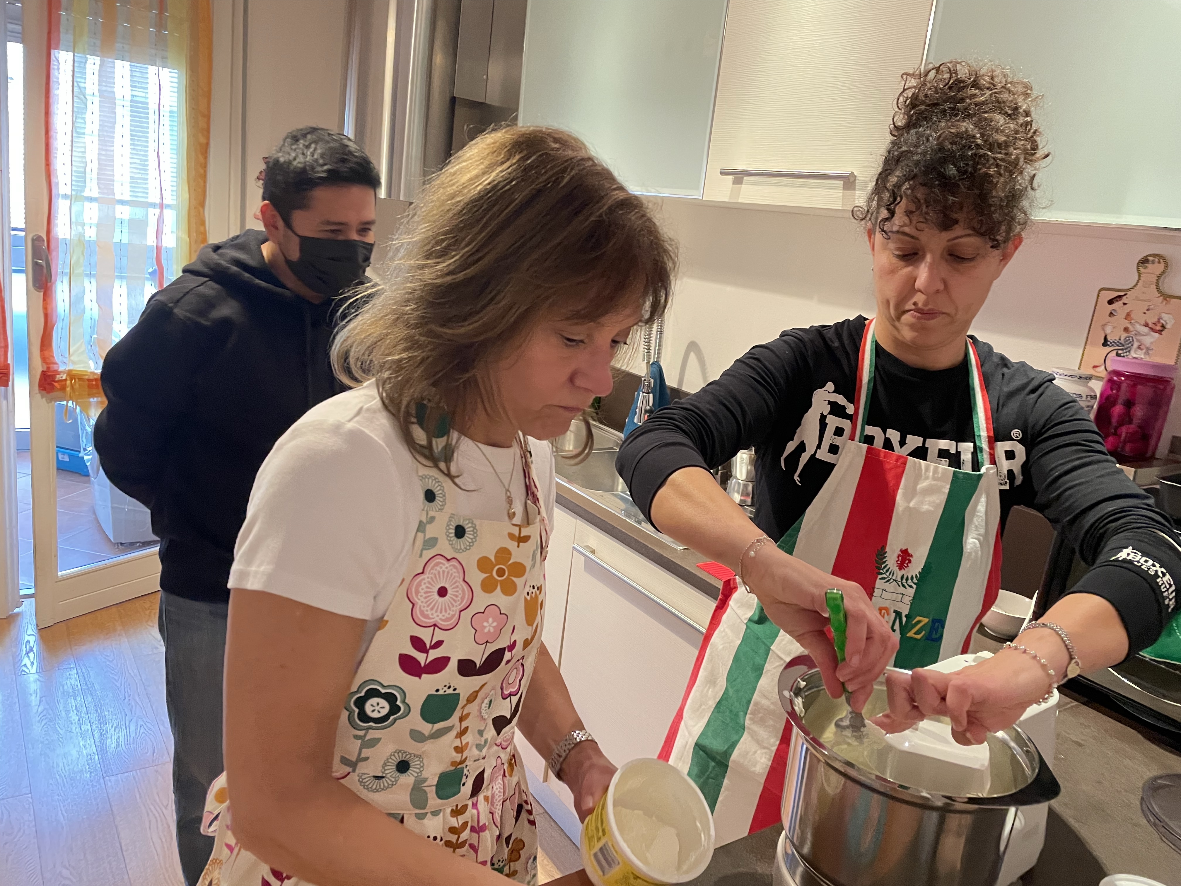 Marscapone cheese is a key ingredient to Tiramisu. Anne scoops… Simona blends.. Giovanni watches. He is fun to have around and it seems like he knows that if he stealthily waits long enough he’ll pounce on that leftover marscapone.