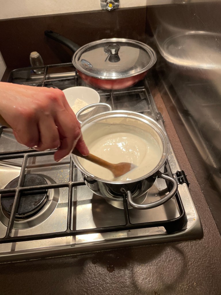 Bechamel sauce for the pasta. Keep stirring. We don’t want lumps. Not a Gluten-free dish.