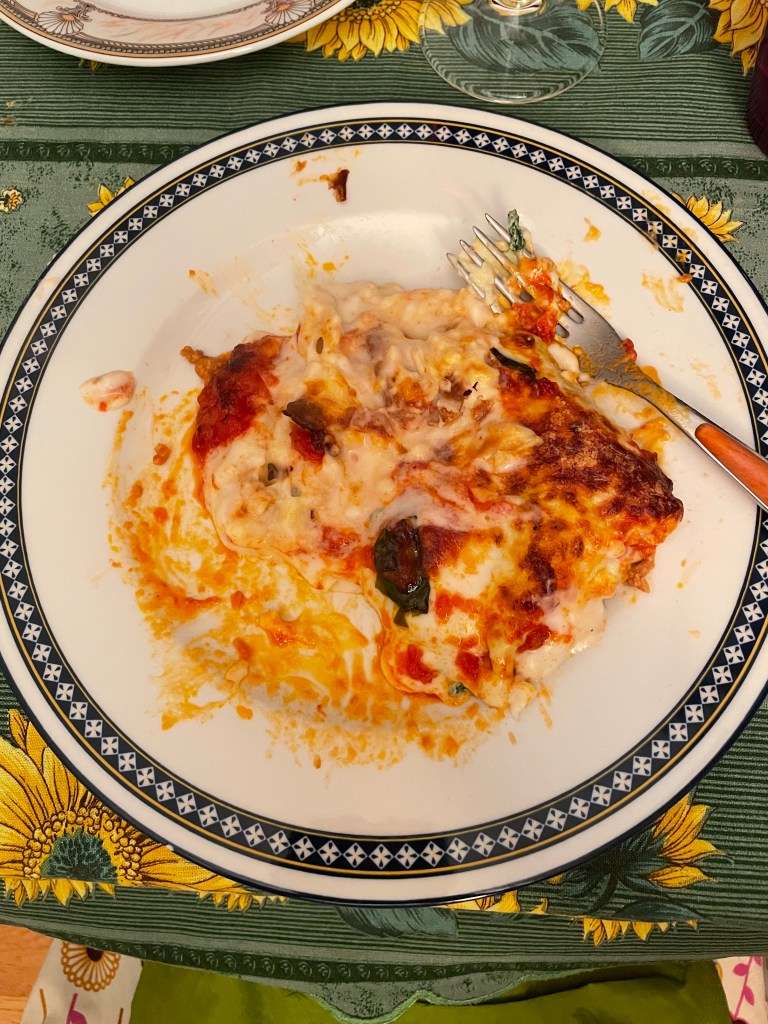 Underneath the basil, Red sauce and Bechamel sauce lies the simple crepe… stuffed with ricotta cheese and spinach. I never would have ordered this item off the menu in a restaurant before Simona showed us “The Light.”Anne’s Ragú features prominently in the lasagne with companion layers of: Bechamel Sauce, Sheet Pasta and Parmesan Cheese. Repeat as often as necessary; we stopped at three layers.