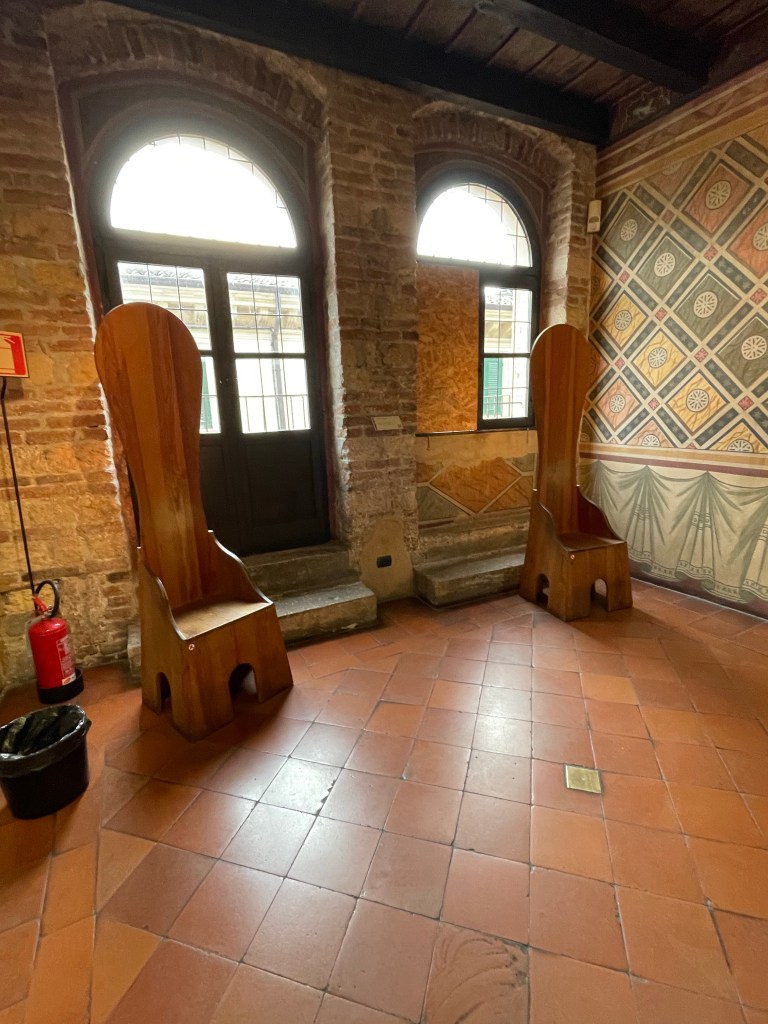 Upon 3’rd floor vestibule of La Casa de Giulietta are placed paired highback’d chairs. These carved and hewn seats be not made for giants, curse damnable your superstitions and fables; but tho’ thy pass by them post-haste to dual-arches leading to THE SOUGHTOUT room.