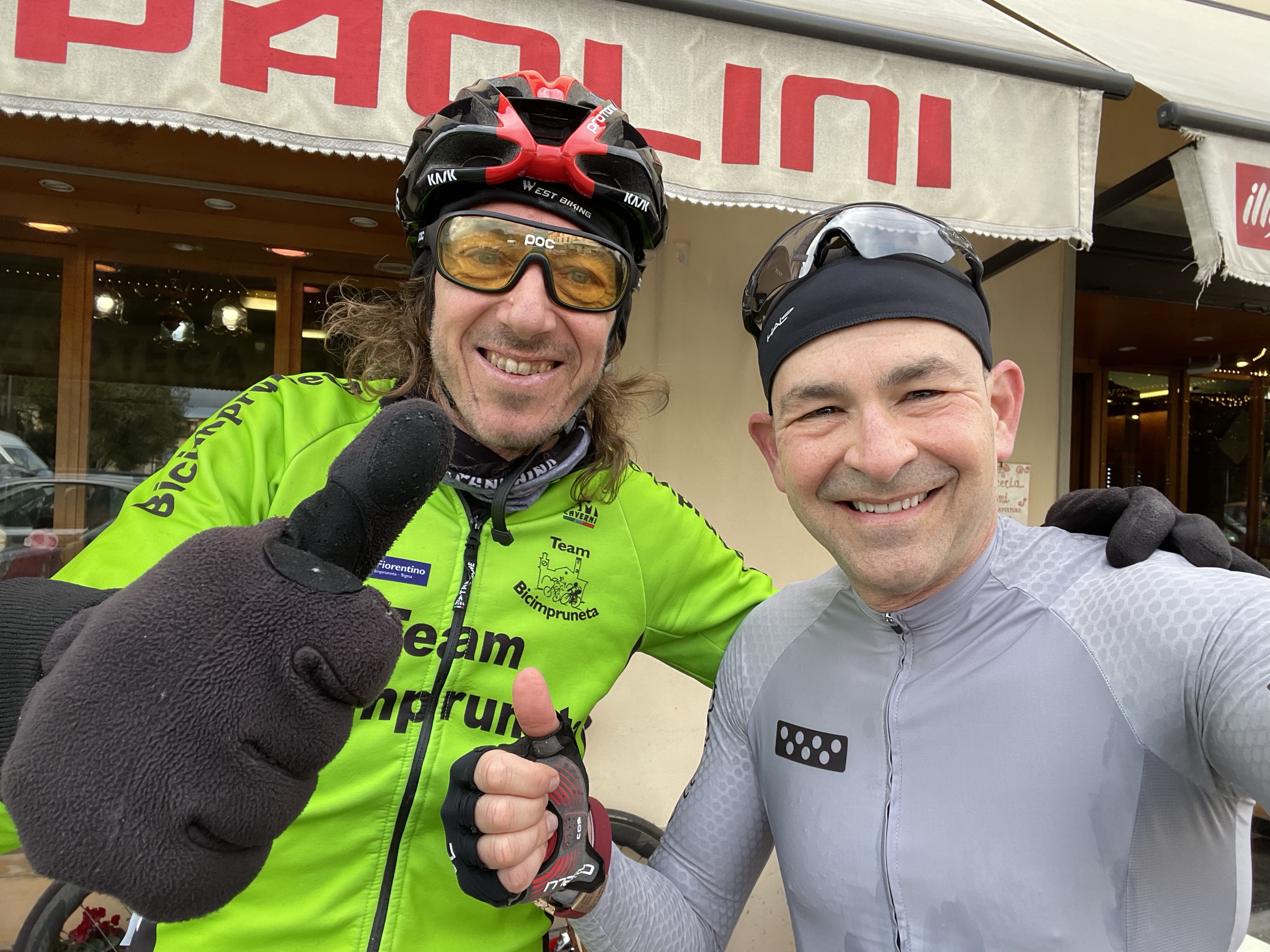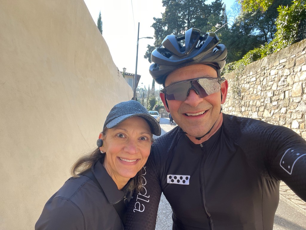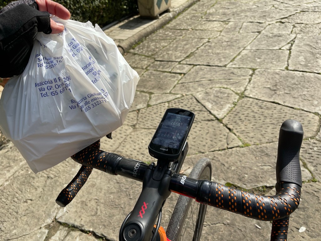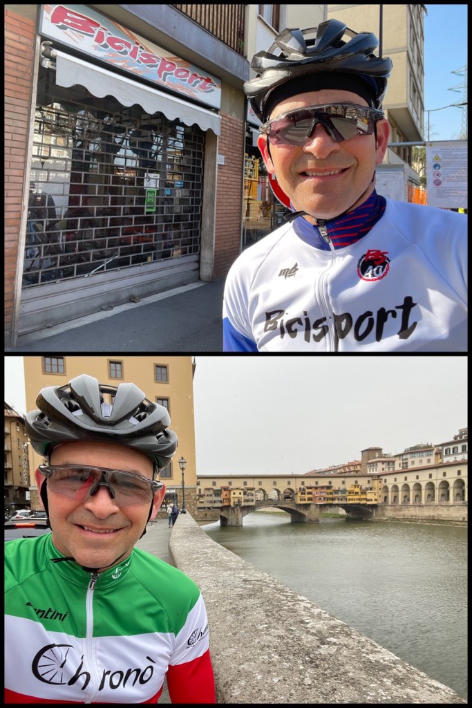 As fortuitous timing in February would have it, my Lovely was returning from her power-walk just as I was also returning from my ride. The unexpected encounter had us both feeling happy to run into, “a friend who also is out and about.” Hannah ran from our Villa to the Via Abramo Lincoln all by herself! Mad nav skills!!! After this photo I gave her a head start back home and we rendezvous’d at the Caffe!This is Gianni, he’s from nearby Impruneta. I gave him a friendly, “Ciao!” when I was riding by and he replied, “Come-a me.” Beyond that explosion of verbosity, Gianni doesn’t speak a lick of English. Nonetheless, we rode for about 80 miles together with him tolerating my broken Italian the entire way. He taught me that eating a creme-filled brioche chased with espresso is the real way cyclists refuel. He also introduced me to his bike-shop buddies in case I ever needed anything. Grazie Mille, Gianni!!The slurry of pedestrians, cyclists, scooters, motorcycles, cars, buses and trucks breeds a healthy coexistence on the stradi. I didn’t run over this guy despite his being square in my gunsights. 😬