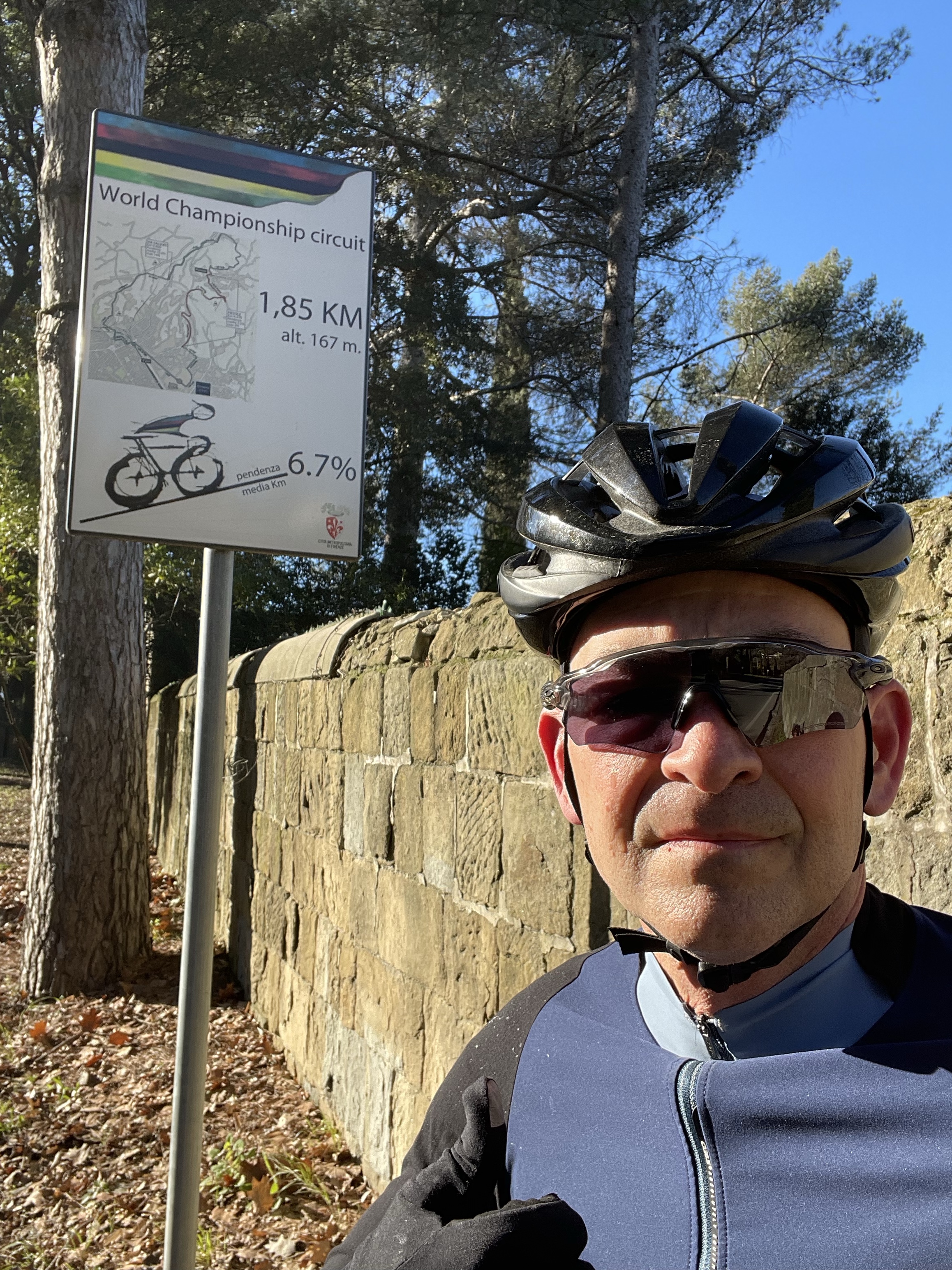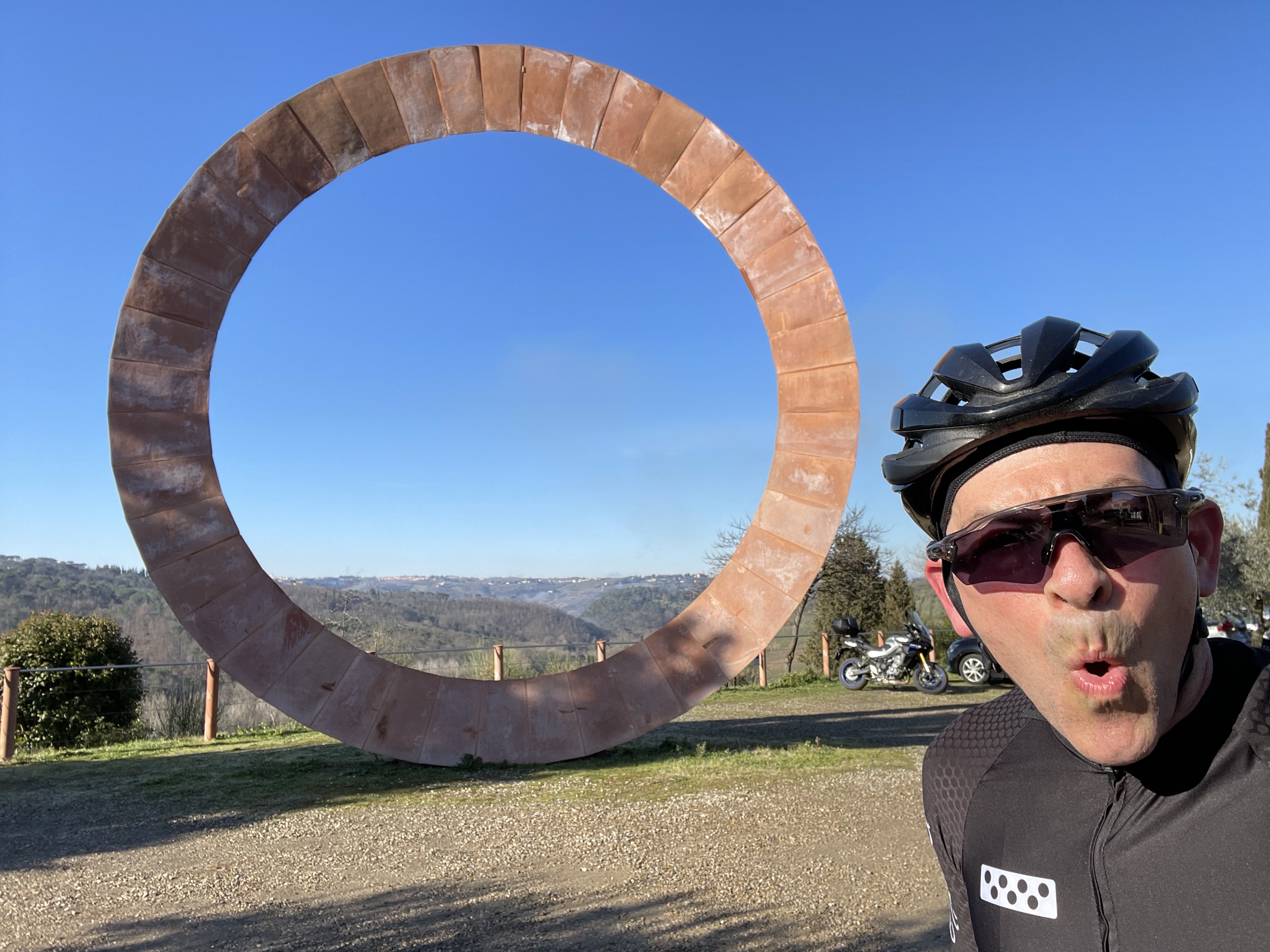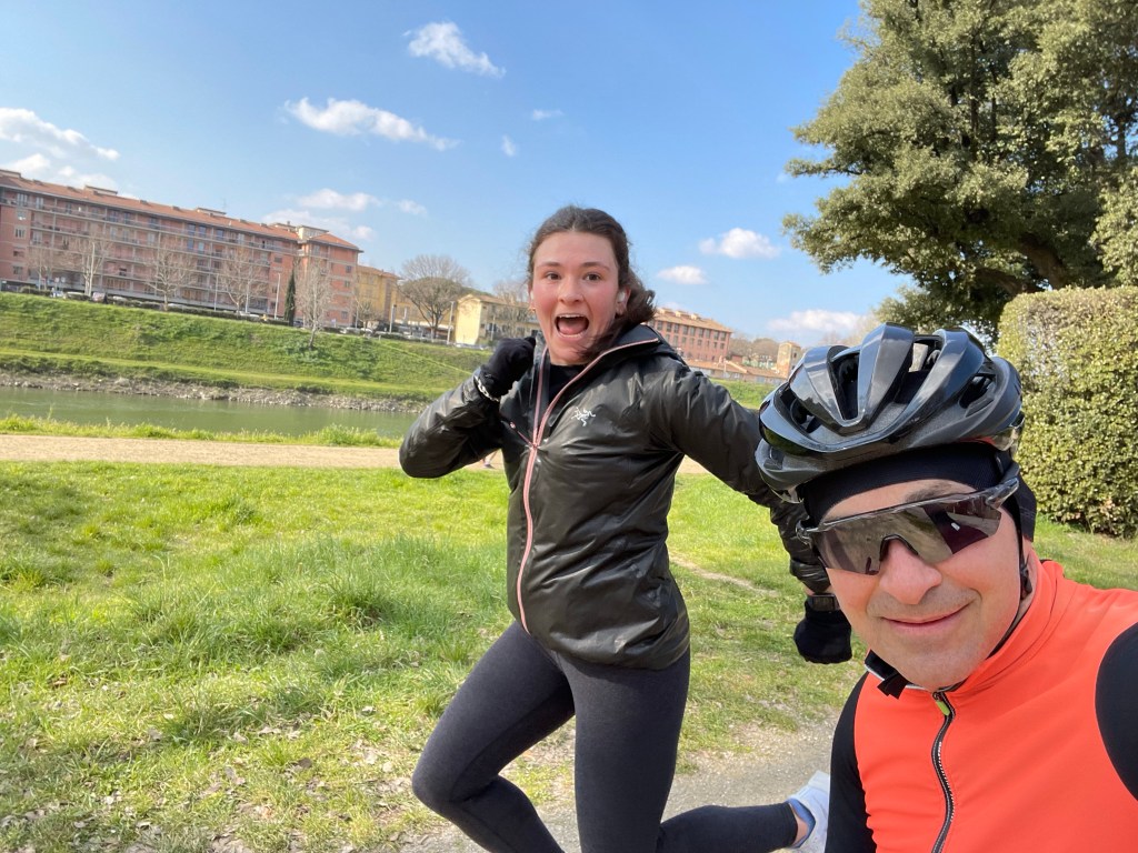 As fortuitous timing in February would have it, my Lovely was returning from her power-walk just as I was also returning from my ride. The unexpected encounter had us both feeling happy to run into, “a friend who also is out and about.” Hannah ran from our Villa to the Via Abramo Lincoln all by herself! Mad nav skills!!! After this photo I gave her a head start back home and we rendezvous’d at the Caffe!This is Gianni, he’s from nearby Impruneta. I gave him a friendly, “Ciao!” when I was riding by and he replied, “Come-a me.” Beyond that explosion of verbosity, Gianni doesn’t speak a lick of English. Nonetheless, we rode for about 80 miles together with him tolerating my broken Italian the entire way. He taught me that eating a creme-filled brioche chased with espresso is the real way cyclists refuel. He also introduced me to his bike-shop buddies in case I ever needed anything. Grazie Mille, Gianni!!The slurry of pedestrians, cyclists, scooters, motorcycles, cars, buses and trucks breeds a healthy coexistence on the stradi. I didn’t run over this guy despite his being square in my gunsights. 😬