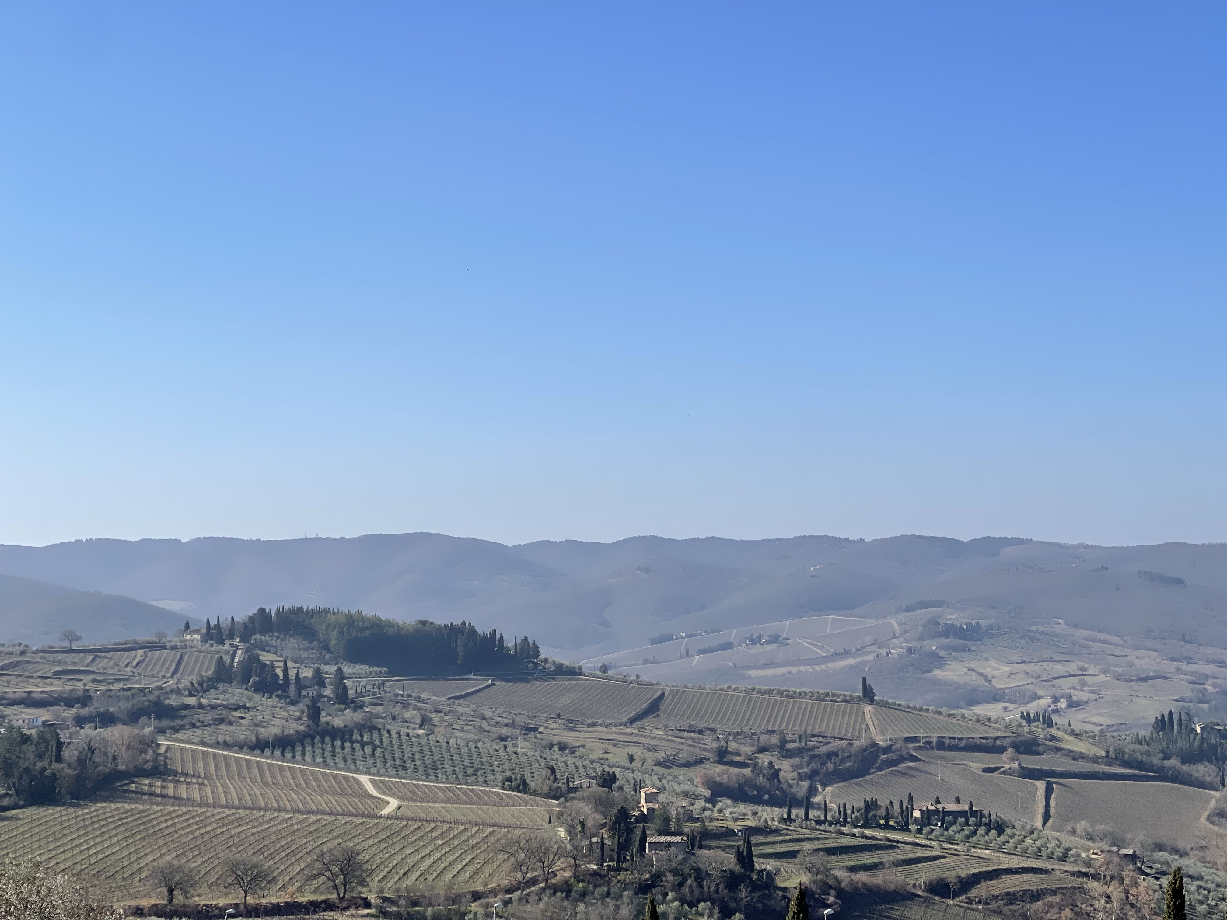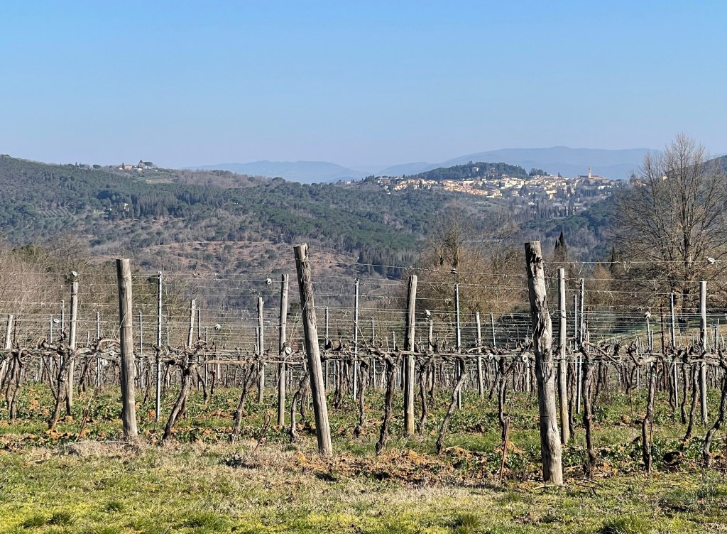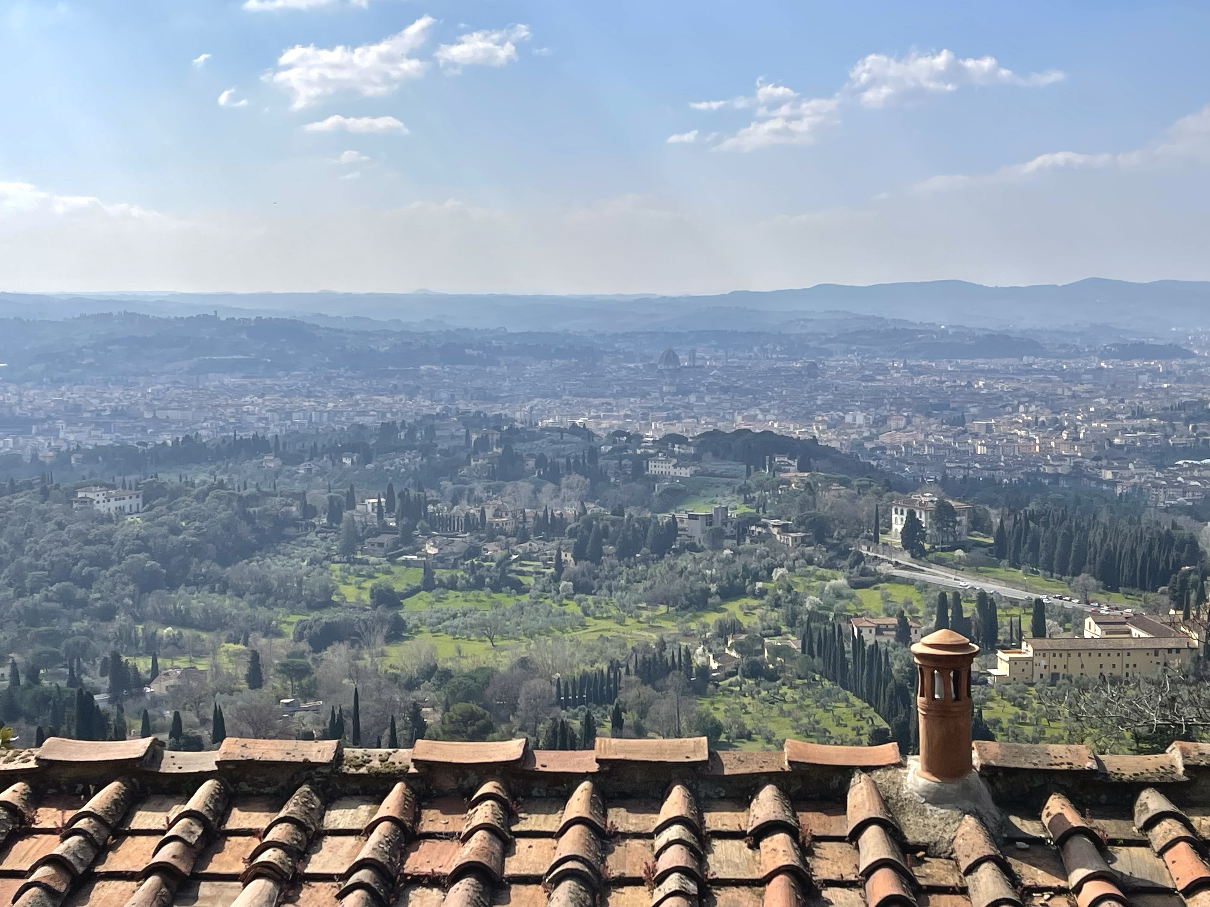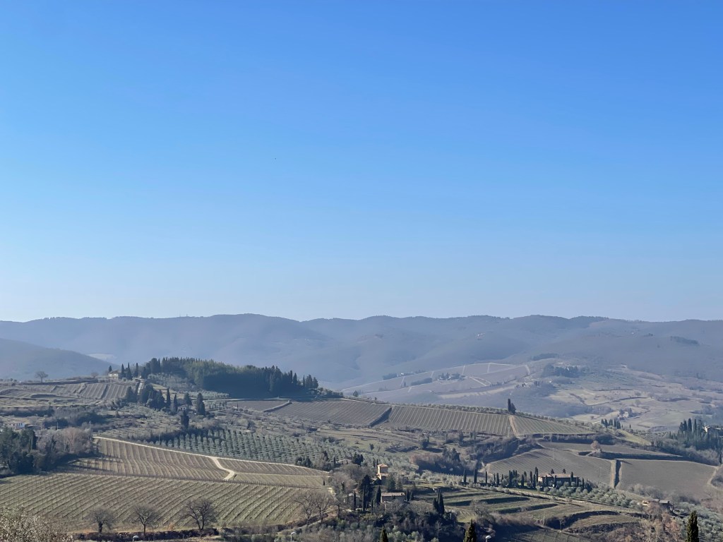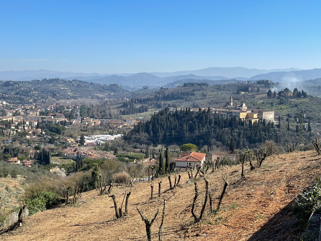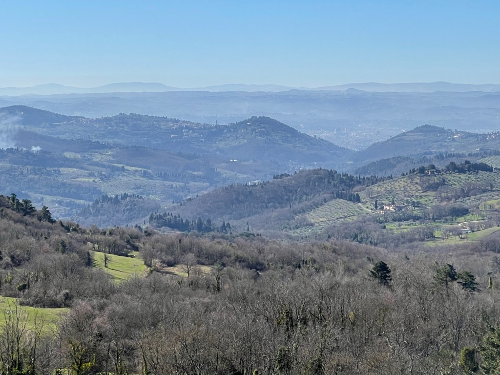 In Fiesole, this hill offers to my mind the ultimate, “on a clear day” view of Firenze. It’s about 1000 feet of elevation and 5-6 miles from the Firenze Centro. Looky, looky! There’s Il Duomo; with it’s reddish-brown hemisphere erupting up from the town like a forehead pimple.The monastery Certosa di Firenze, in Galuzzo. That smoke on the right side of the picture is normal; it’s likely a lot of tree and vine trimmings… these kinds of fires are common all over the area.Big rolling hills full of olives and grapes – near Panzano. See the little Duomo? The hills of Pratolino, north of Firenze.