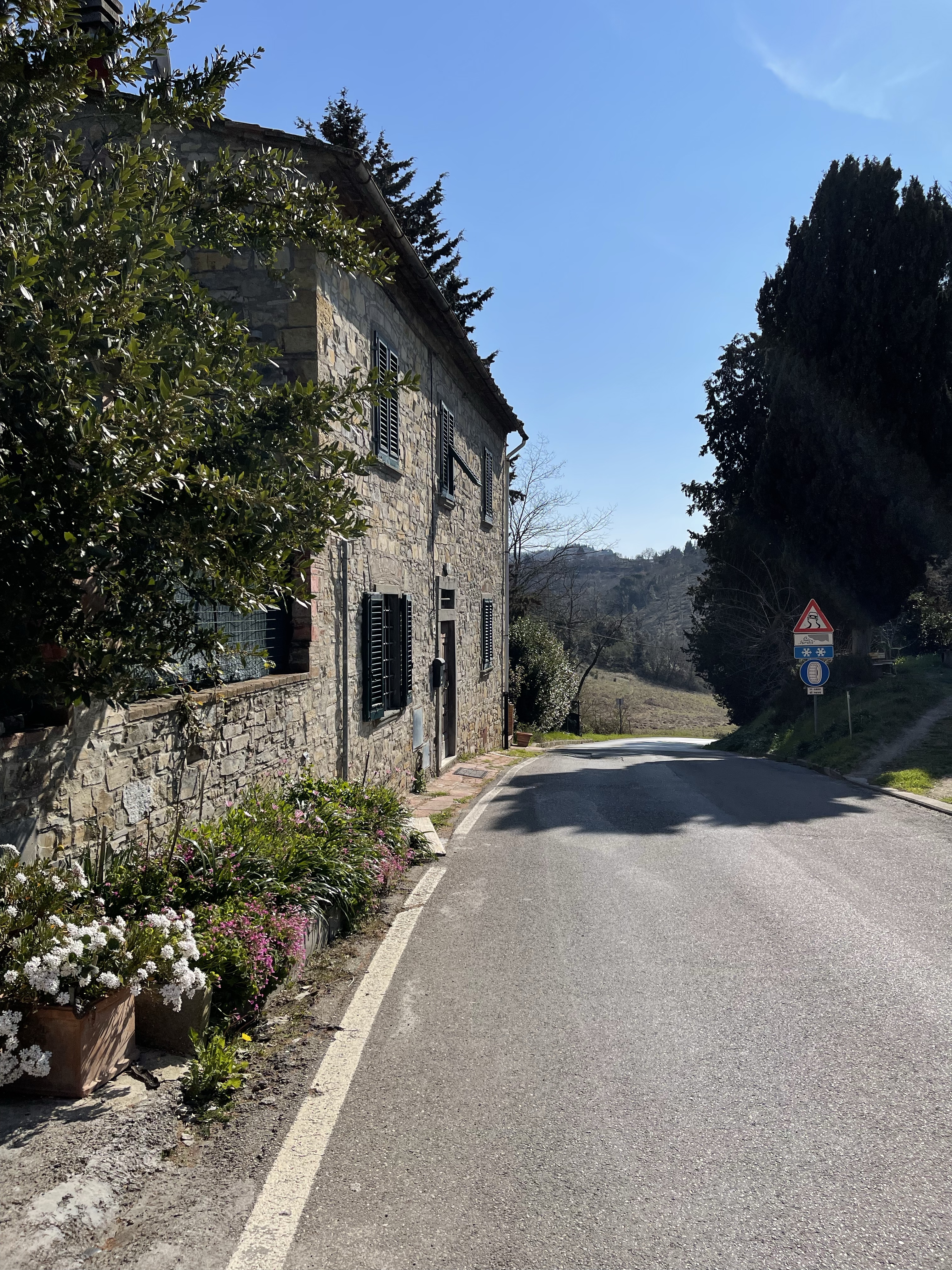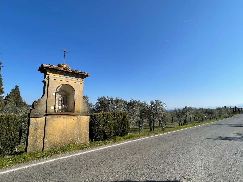 There are shrines everywhere in the countryside gracing the olive tree fields and vineyards. This one is near San Casciano. It’s clear by the generally good condition of these things they’re still revered within the culture.There are three roads I can take in/out of our neighborhood, “Bagno a Ripoli.” This wall runs pretty continuously throughout two of them and this section is a hill that screams at me, “The FINAL push… what’s left in the tank?”This is taken way, way to the north of Florence in Scarperia. There’s also a Grand Prix Motorcycle track in the same town which would have made for another awesome pic. Sorry, don’t have one.To the South, in a little town of San Donato rests this quaint little abode. The old man who lives there came out to water his flowers as I was clicking away. He seemed happy and I mentioned that I liked his flowers.Taken in Calenzano, this Campanile (Bell Tower) is in the hills North of Firenze. I haven’t ridden there much because the prevailing winds are our out of the NE … the climbs are steeper / longer and the terrain offers less natural shield from said gusts.