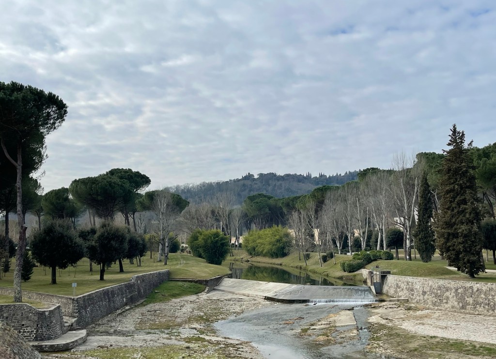 The fortress in San Casciano in Val di Pesa has a deer patrolling the parapet. I don’t know why it’s there but I love how this picture came out. The sun’s corona sure makes the deer seem divinely placed, no?“Oh. That’s what it is.”The American Cemetery in nearby Tavernuzze is beautiful in it’s conception and how it has grown in. This dam is at the end of a series of small, shallow canals on the cemetery grounds. The golden hills/grass you can see center/right in the pic through the trees are where American WW2 casualties’ are buried.